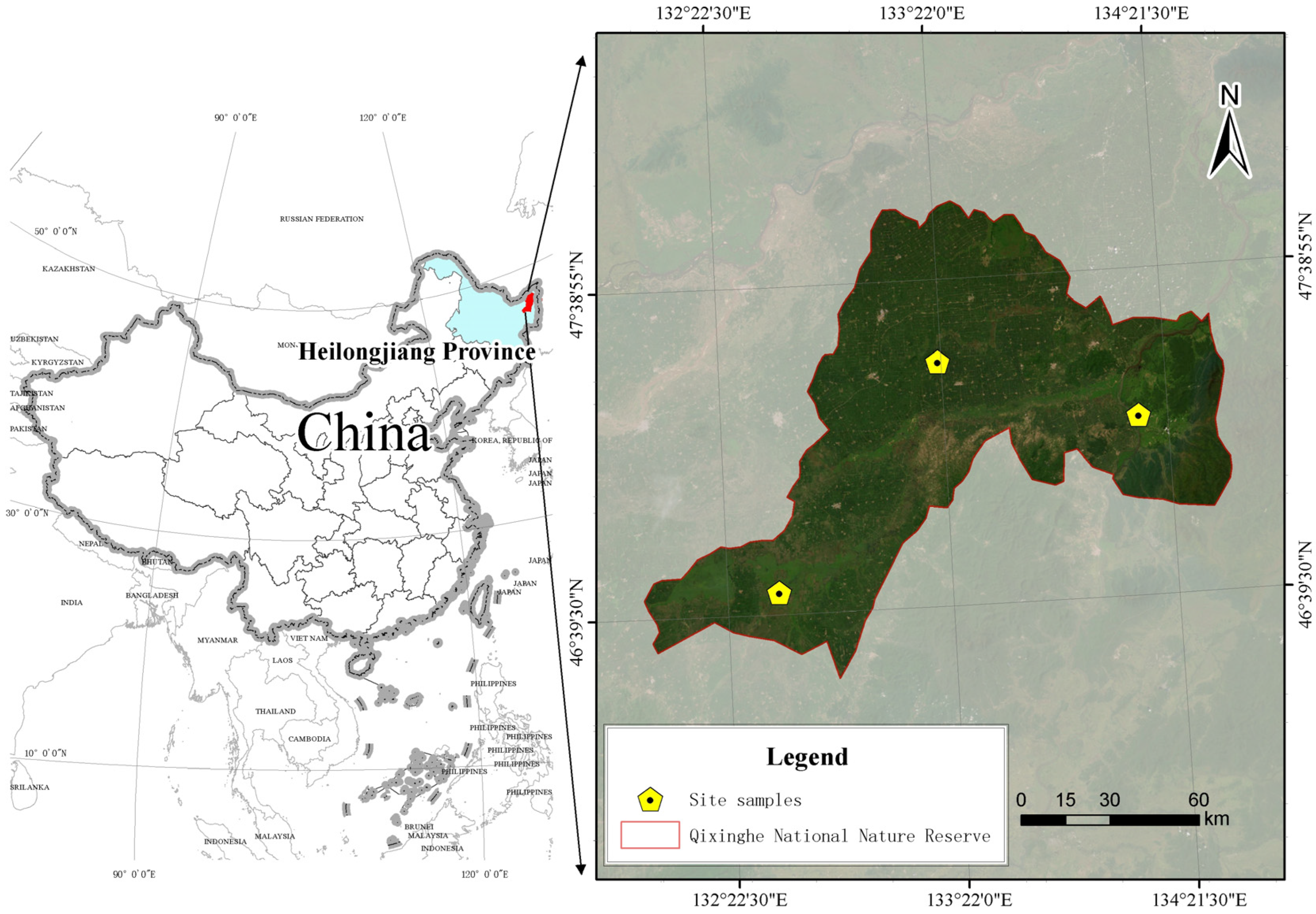 6. Wang, J.; Liu, H.; Wang, X.; Zhang, L.; Wang, X.; Zhang, H. Vegetation and environmental interpretation of the Qixing River National Nature Reserve wetland in Heilongjiang Province. Wetl. Sci. 2018, 16, 481–487. [Google Scholar]