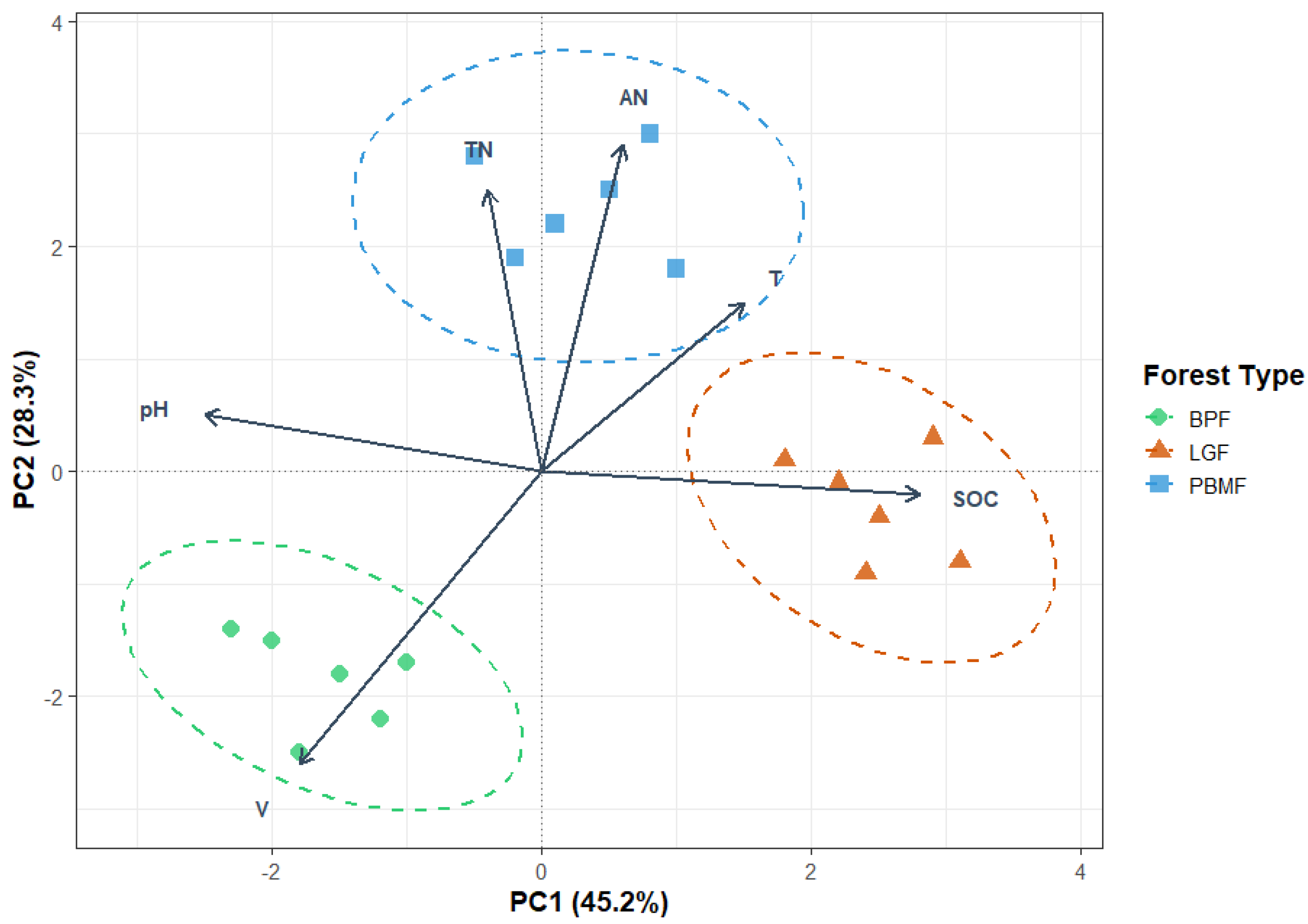 Figure 3. Principal Component Analysis (PCA) of standardized soil properties across island-like forests (BPF, LGF, PBMF). Points are plot-level observations (n = 5 per forest type) with dashed 95% confidence ellipses around group centroids. Arrows denote variable loadings (SOC, TN, AN, pH, volumetric water content V, soil temperature T); arrow length approximates contribution to the ordination and angles approximate correlations among variables. Axes are labeled with the proportion of variance explained (PC1 = 45.2%, PC2 = 28.3%). Scaling = 2 (correlation biplot). Group separation indicates that soil stoichiometry (SOC, C:N, N availability) together with moisture and temperature structure the environmental space occupied by the three forest types (LGF aligned with SOC; PBMF with T/TN/AN; BPF with higher V and pH).