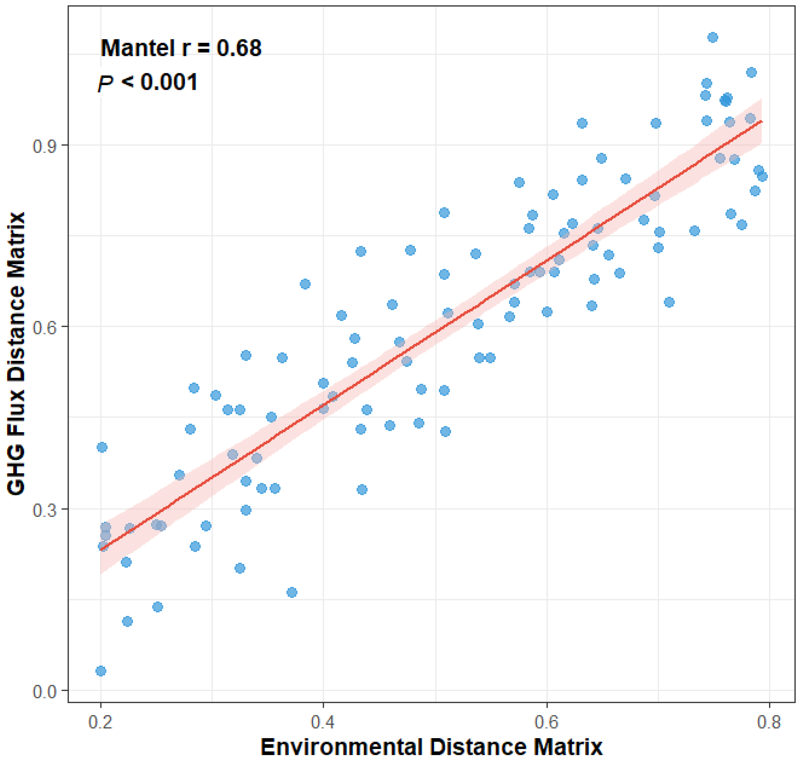 Figure 5. Relationship between environmental dissimilarity and greenhouse gas (GHG) flux dissimilarity among three island-like forests in the Sanjiang Plain. Each point represents a pairwise comparison between plots (n = 5 plots per forest type). The Mantel test (r = 0.68, p < 0.001) indicates a strong correlation, with the red line showing the fitted regression and shaded area denoting the 95% confidence interval.