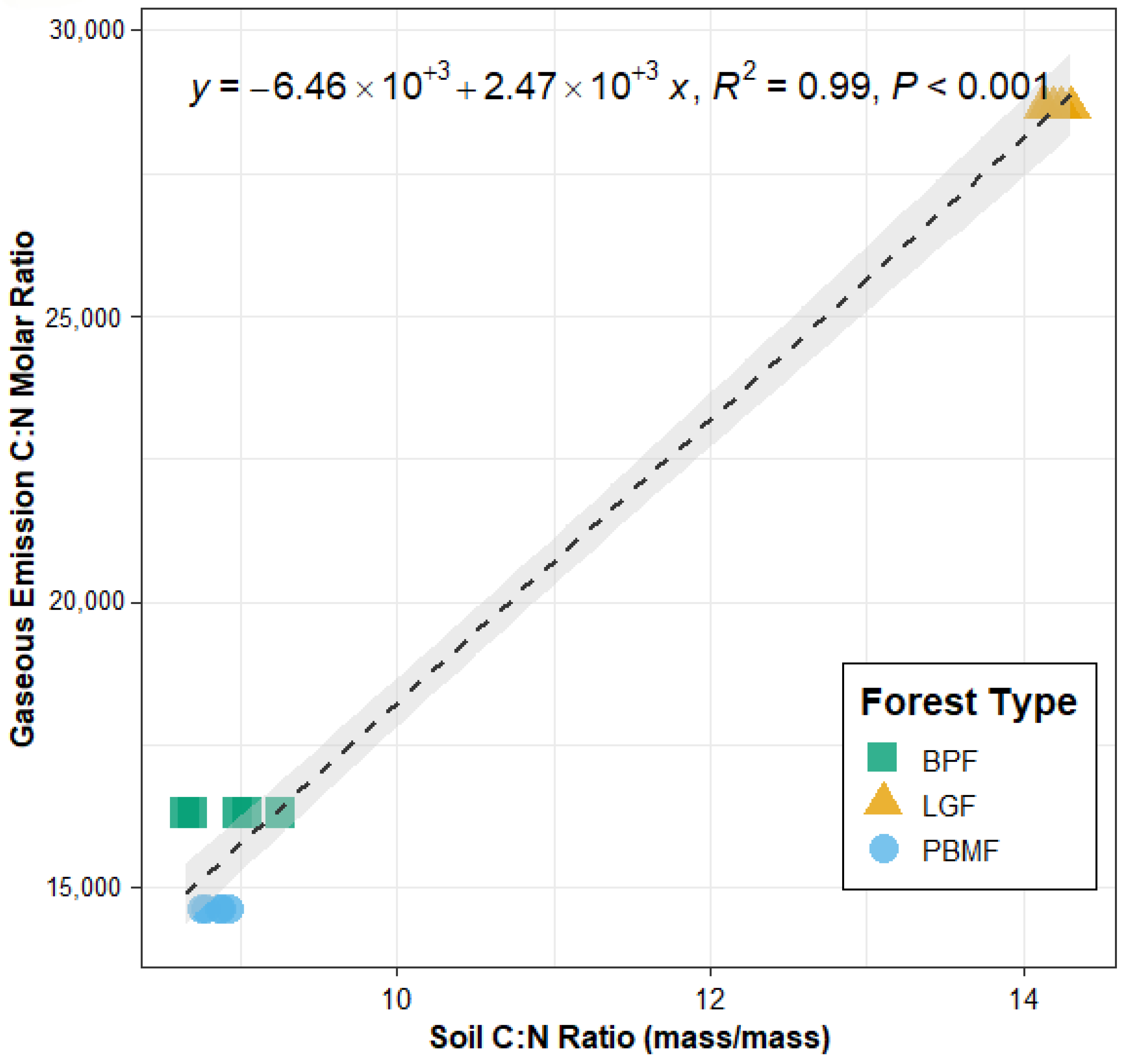 Figure 6. Linear relationship between soil C:N ratio (mass basis) and the gaseous C:N molar emission ratio (CO2-C/N2O-N) across the three forest types Data points represent mean values ± SE (n = 5 plots per forest type). The regression equation, coefficient of determination (R2 = 0.99), and significance level (p < 0.001) are shown.
