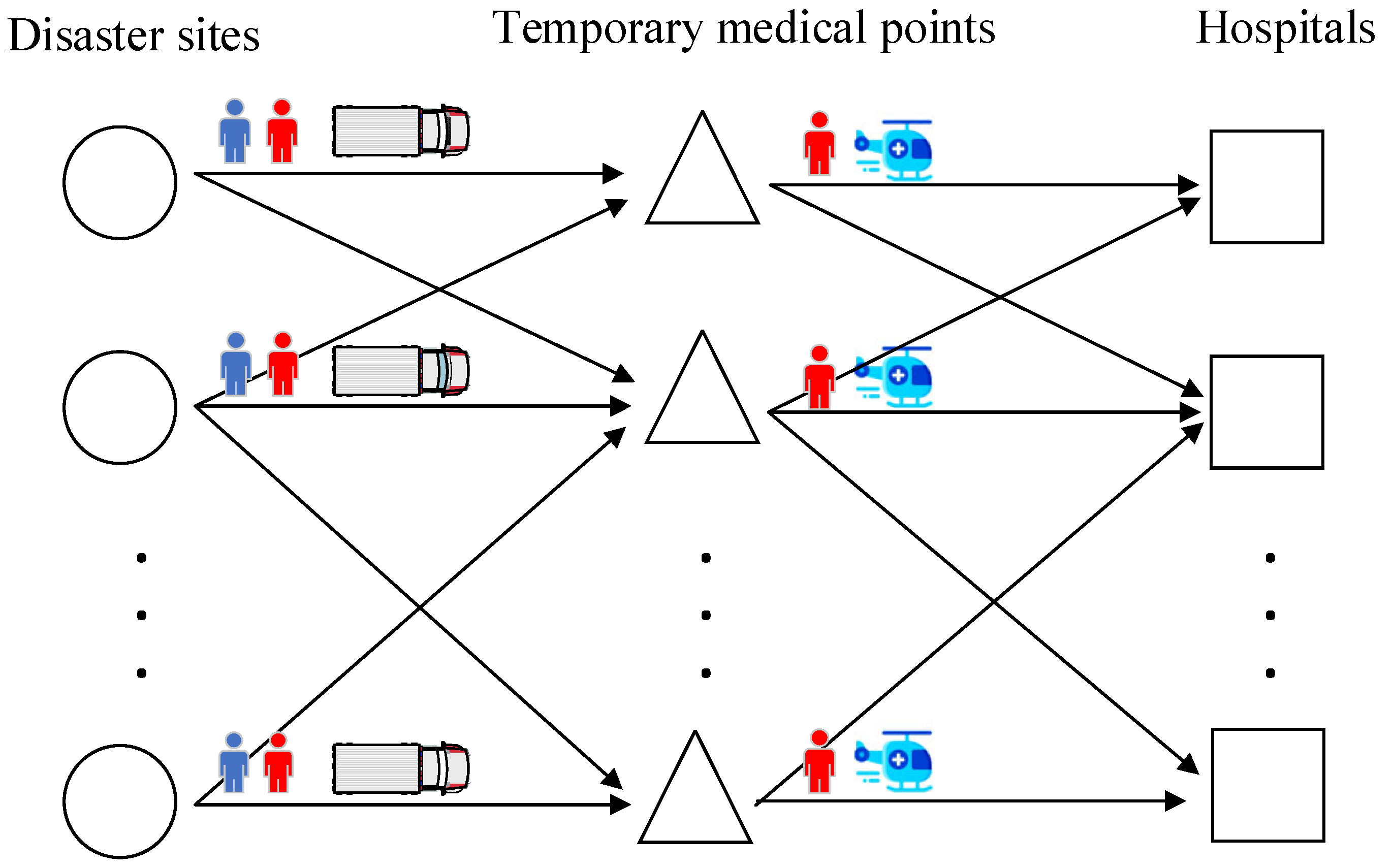 | The quantity of serious casualties transported from disaster site through temporary medical point to hospital , where , , | ||