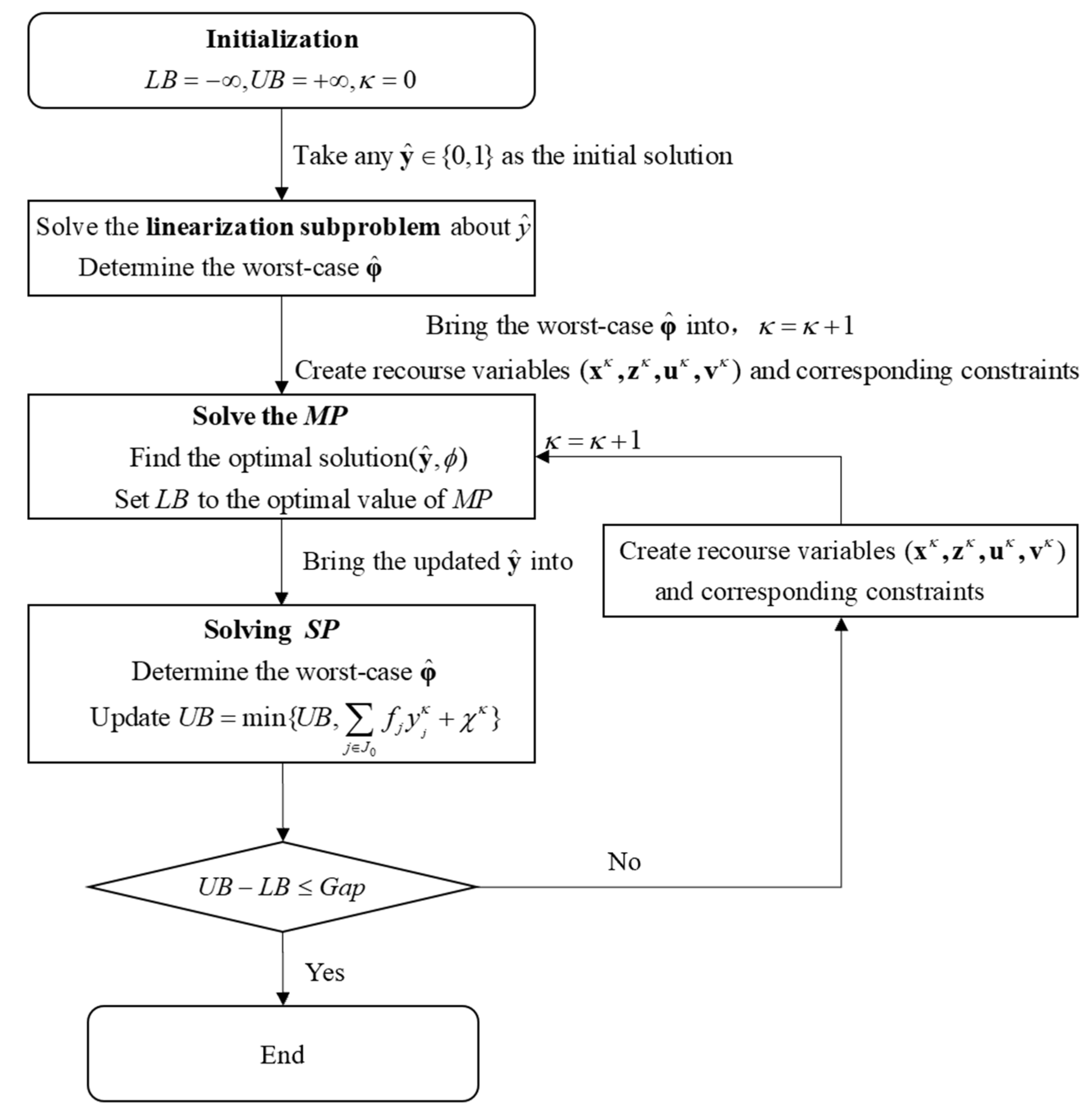 | Initialization: Let , Set , . Take any feasible solution as the initial solution. Step 1: Solve the linearized subproblem with respect to to determine the worst-case scenario for . Update . Establish the recourse variables and their respective constraints, and incorporate them into the MP model. Step 2: Solve the MP to find the optimal solution . Assign the optimal value of the MP to the variable LB. Step 3: Solve the SP with respect to to determine the worst-case scenario for . Update: Step 4: If , terminate; otherwise, update and establish recourse variables and their associated constraints. Add them to the MP and then proceed to step 2. |
