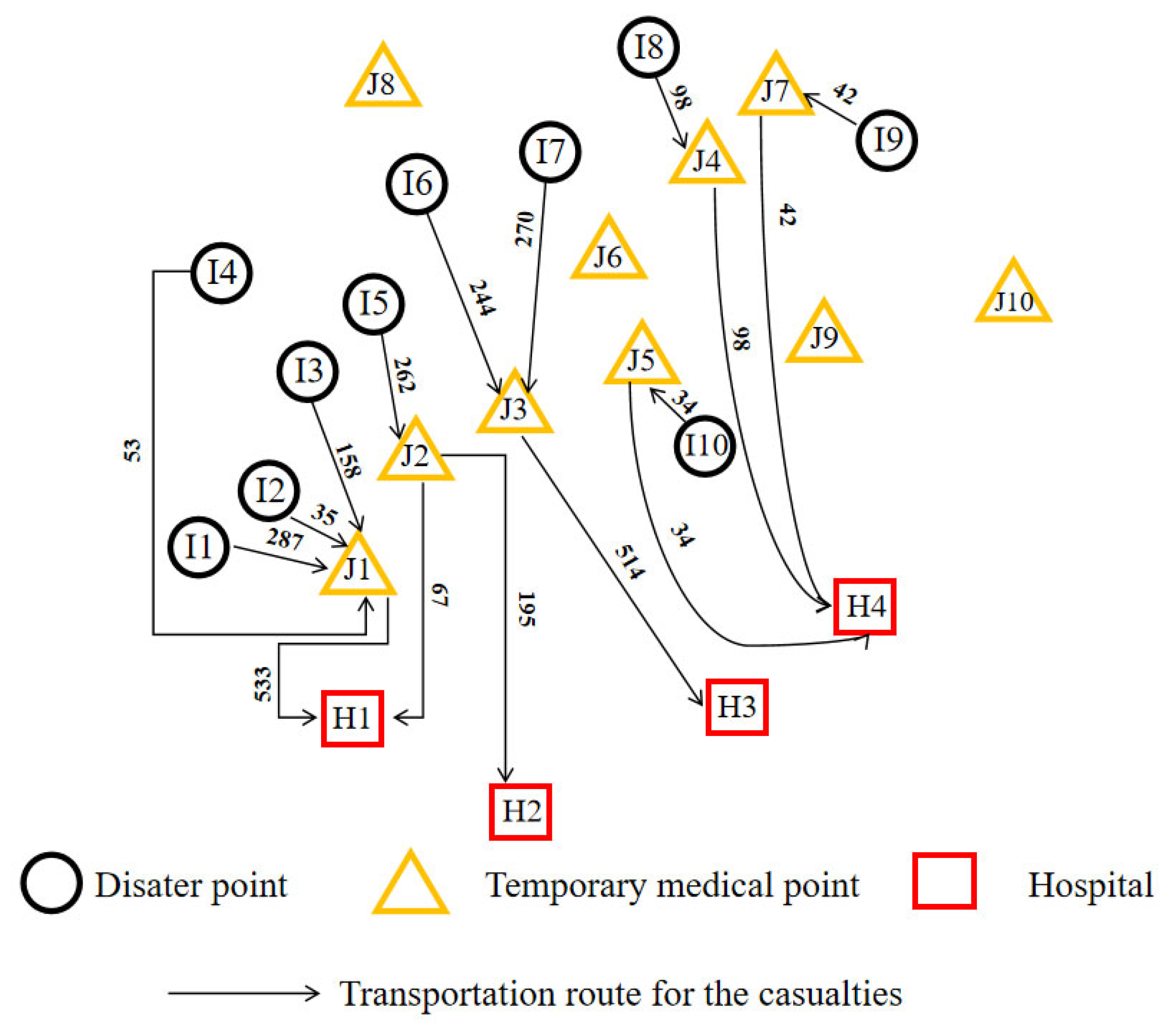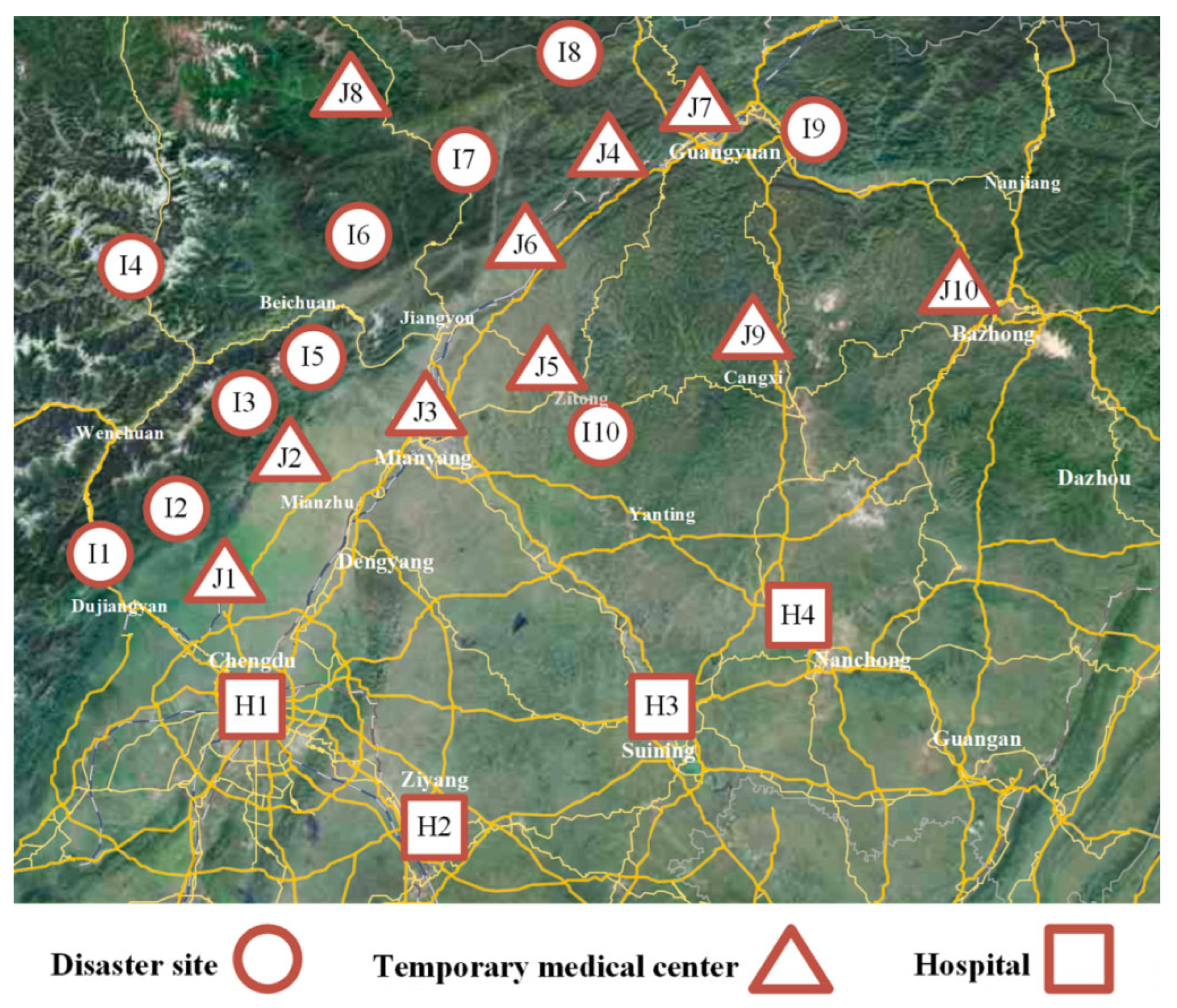 - Liu, Y.; Cui, N.; Zhang, J.H. Integrated temporary facility location and casualty allocation planning for post-disaster humanitarian medical service. Transp. Res. Part E-Logist. Transp. Rev. 2019, 128, 1–16. [Google Scholar] [CrossRef]