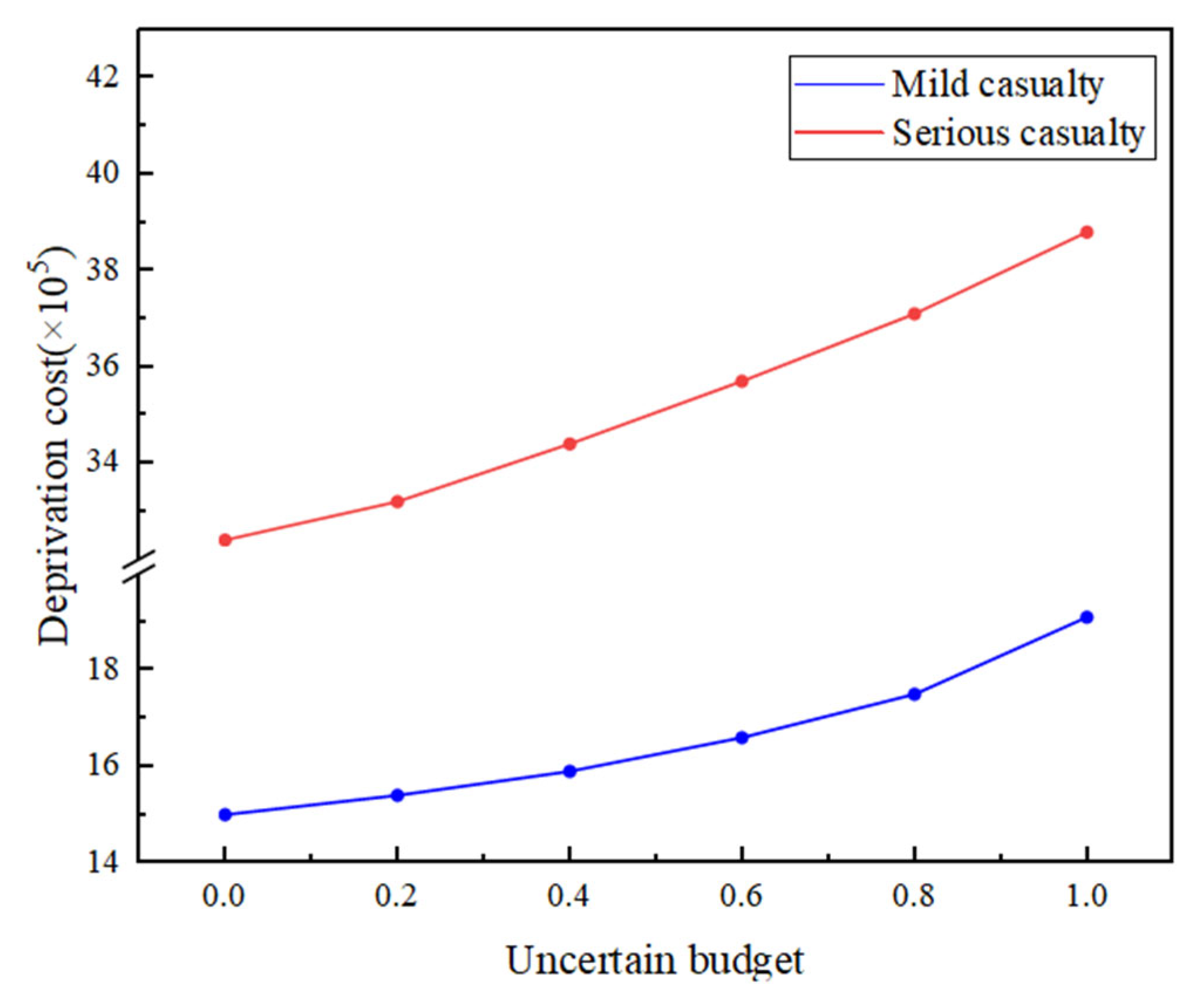 - The higher the degree of parameter uncertainty, the greater the deprivation costs. Compared to mild casualties, severe casualties have a more significant impact on deprivation costs. Across uncertainty budgets ranging from 0 to 1, total system cost consistently rises. When both mild and serious casualties fluctuate jointly, serious casualties exert a disproportionately large influence on deprivation cost increases. Scenario analysis further shows that when serious casualties vary by ±30%, the total cost ranges from 58.04 million to 95.93 million yuan, compared with the baseline 80.09 million yuan.