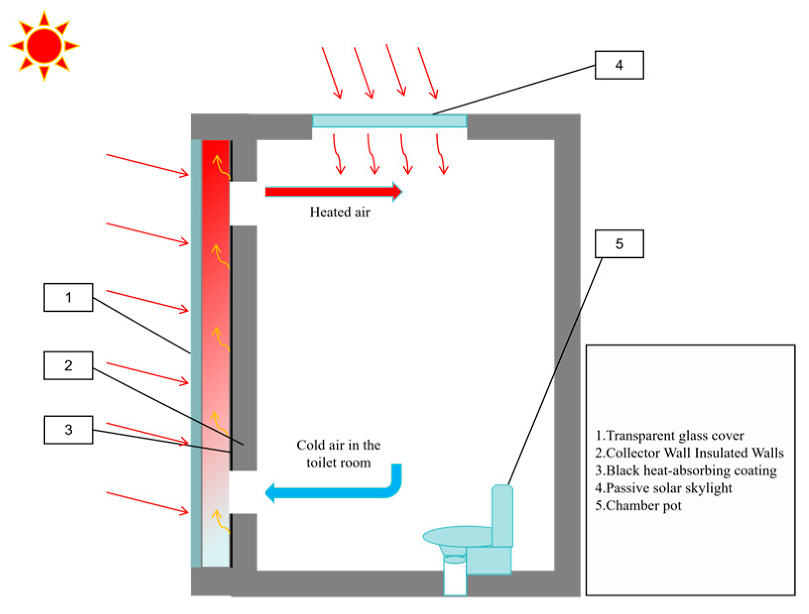 - Chao, Z. Study on Improving Effect of Solar Heating on Rural Toilet Thermal Environment in Qinghai Area. Master’s Thesis, Yanshan University, Qinhuangdao, China, 2022. [Google Scholar] [CrossRef]