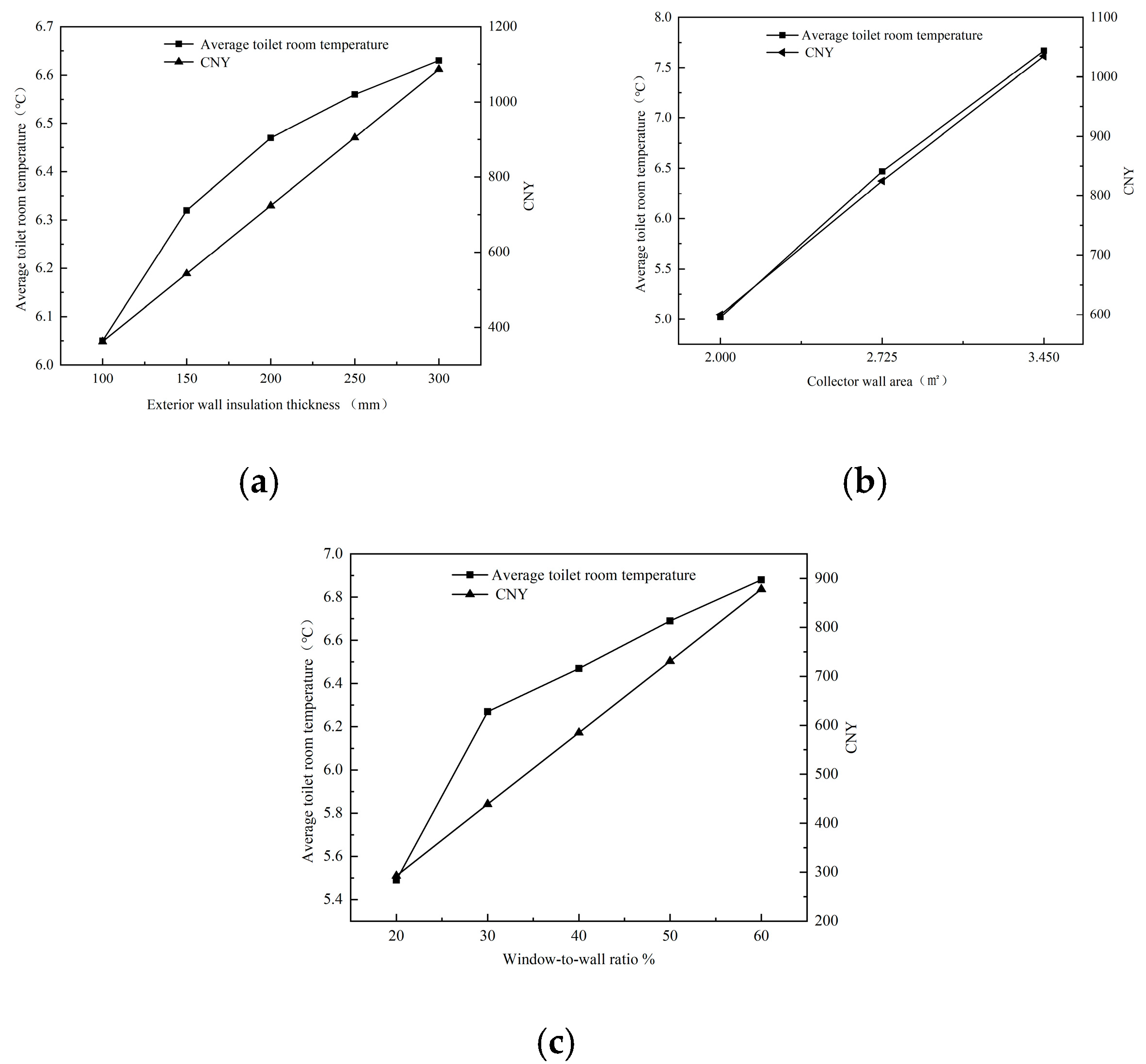 3.2.1. Optimal Parameter Determination of Exterior Wall Insulation Thickness (A), Collector Wall Area (D), and Window-to-Wall Ratio (C) of the Toilet House