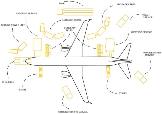 Example of the arrangement of devices in the process of ground handling of an aircraft, adapted from [39].