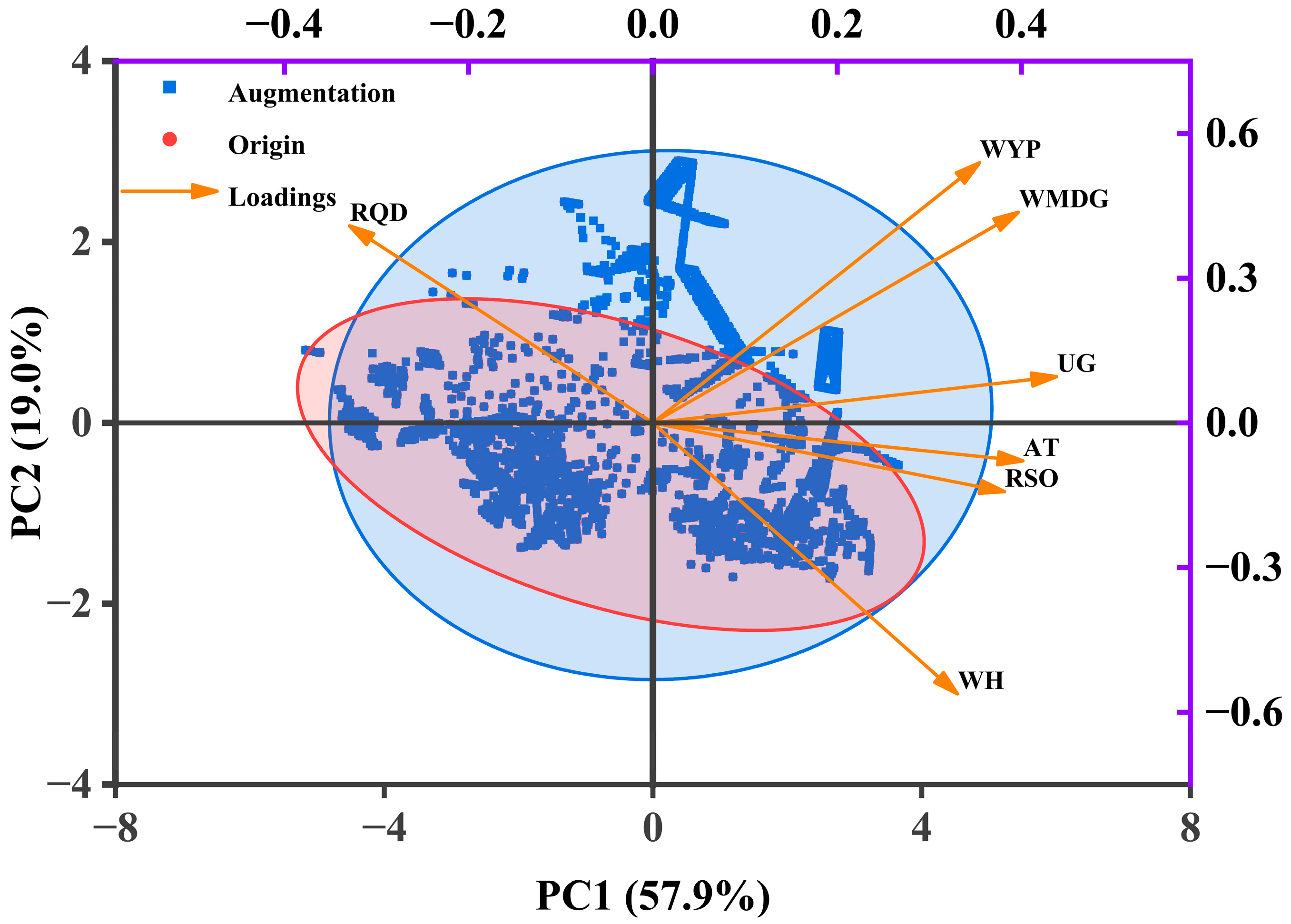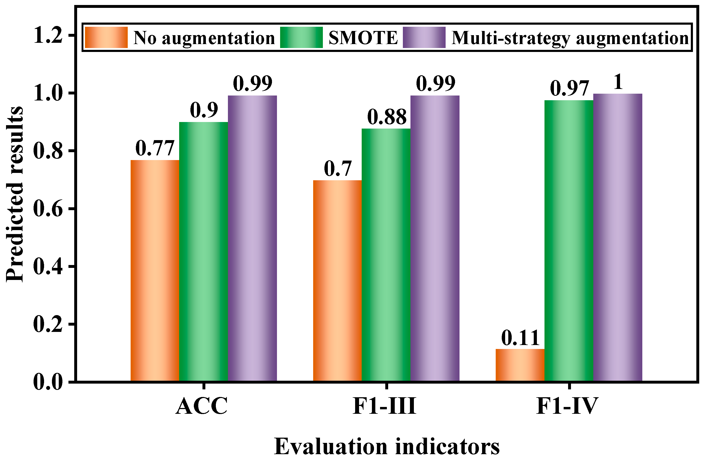 - Expansion of sample space through multi-strategy data augmentation: By integrating SMOTE, ADASYN, and Borderline-SMOTE, the proposed multi-strategy data augmentation method expands the dataset by 6.4 times and improves model ACC by 22.26%. This approach achieves density balancing and local feature enhancement, effectively addressing the issue of low prediction accuracy in tunnel water and mud inrush hazard classification caused by insufficient samples. It provides a generalizable solution for small-sample challenges in engineering applications.