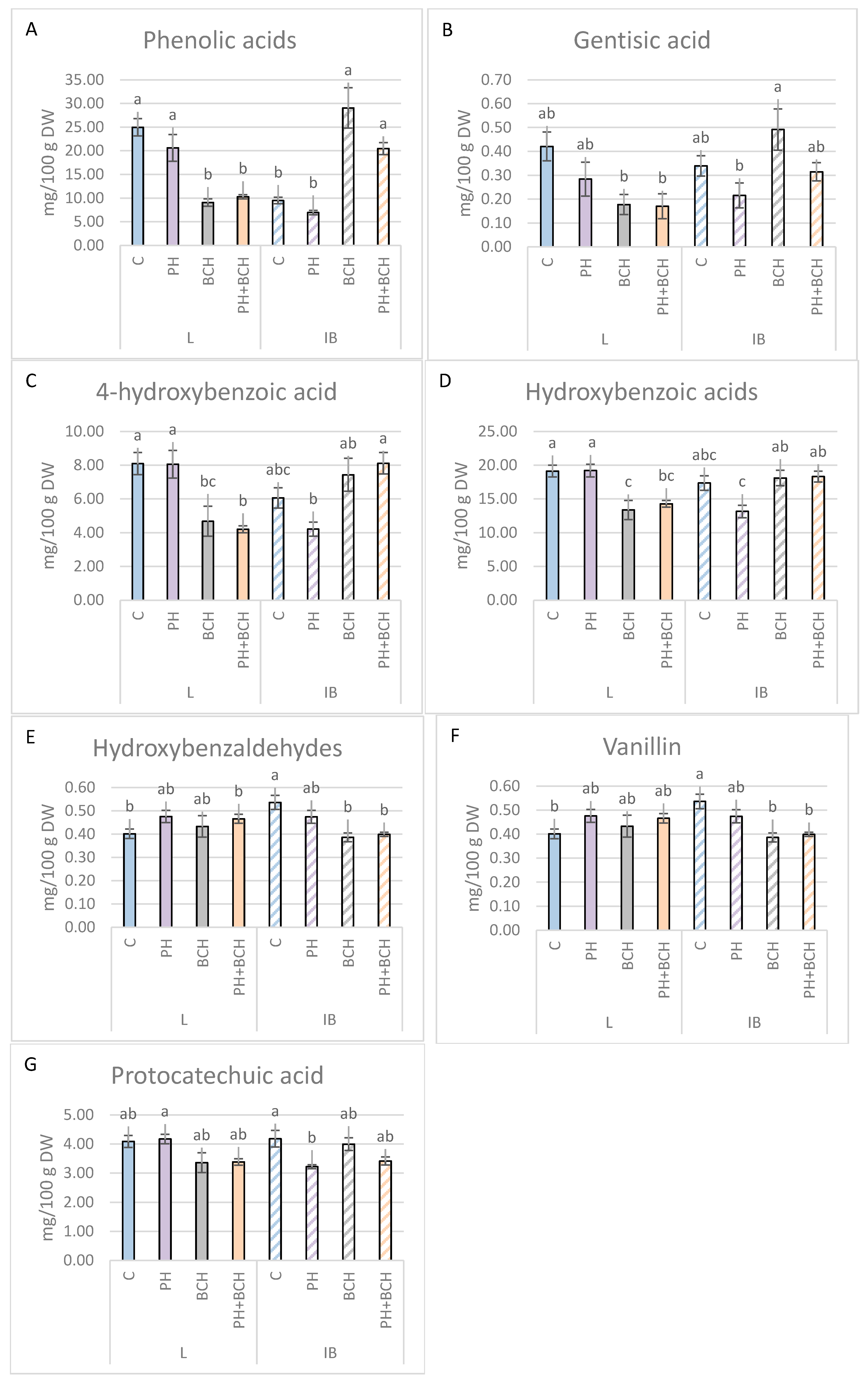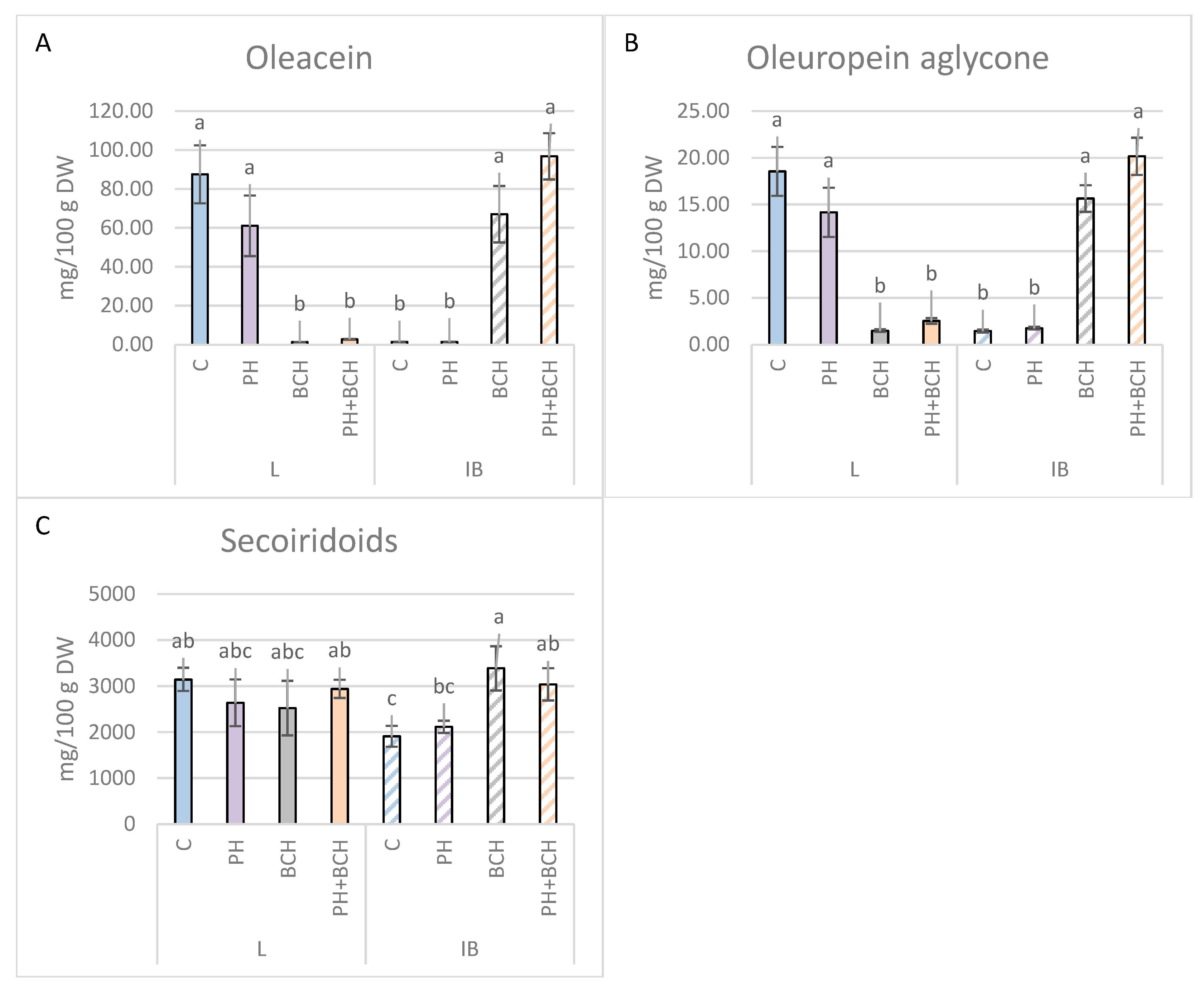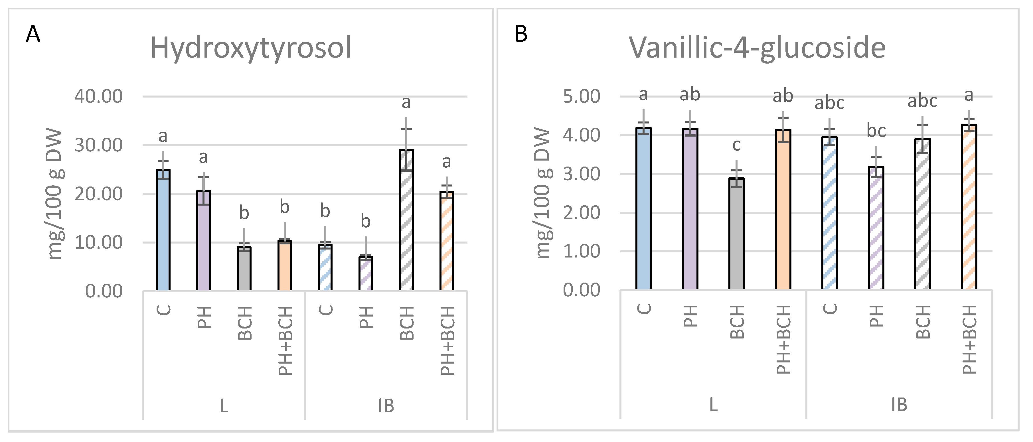 3.1. Effects of Biochar and/or Phenolic Extracts on Phenolic Contents in Olive Leaves