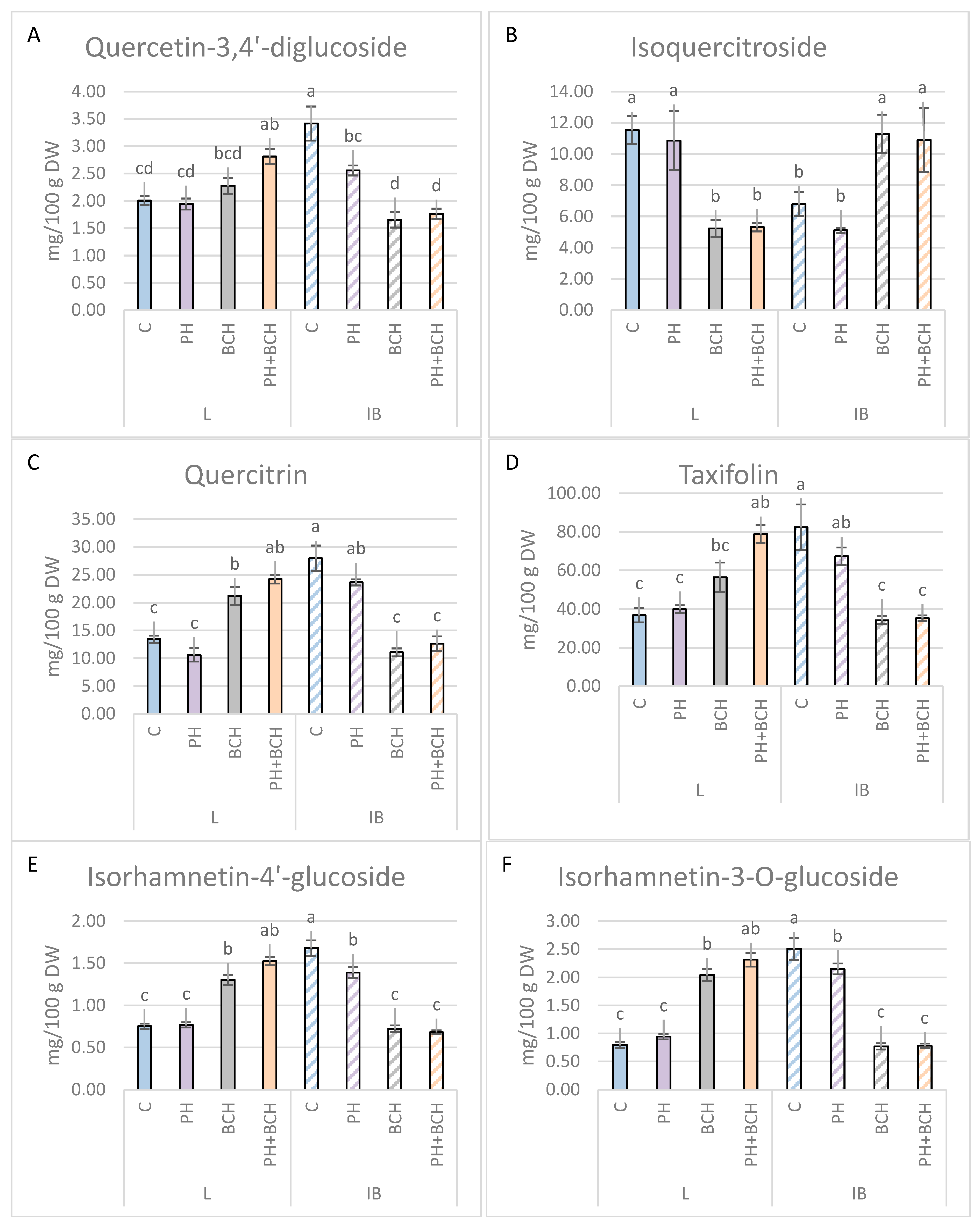 | Isorhamnetin | +5.5 | −26.9 | +80.5 | −58.3 | +105.5 | −62.6 |