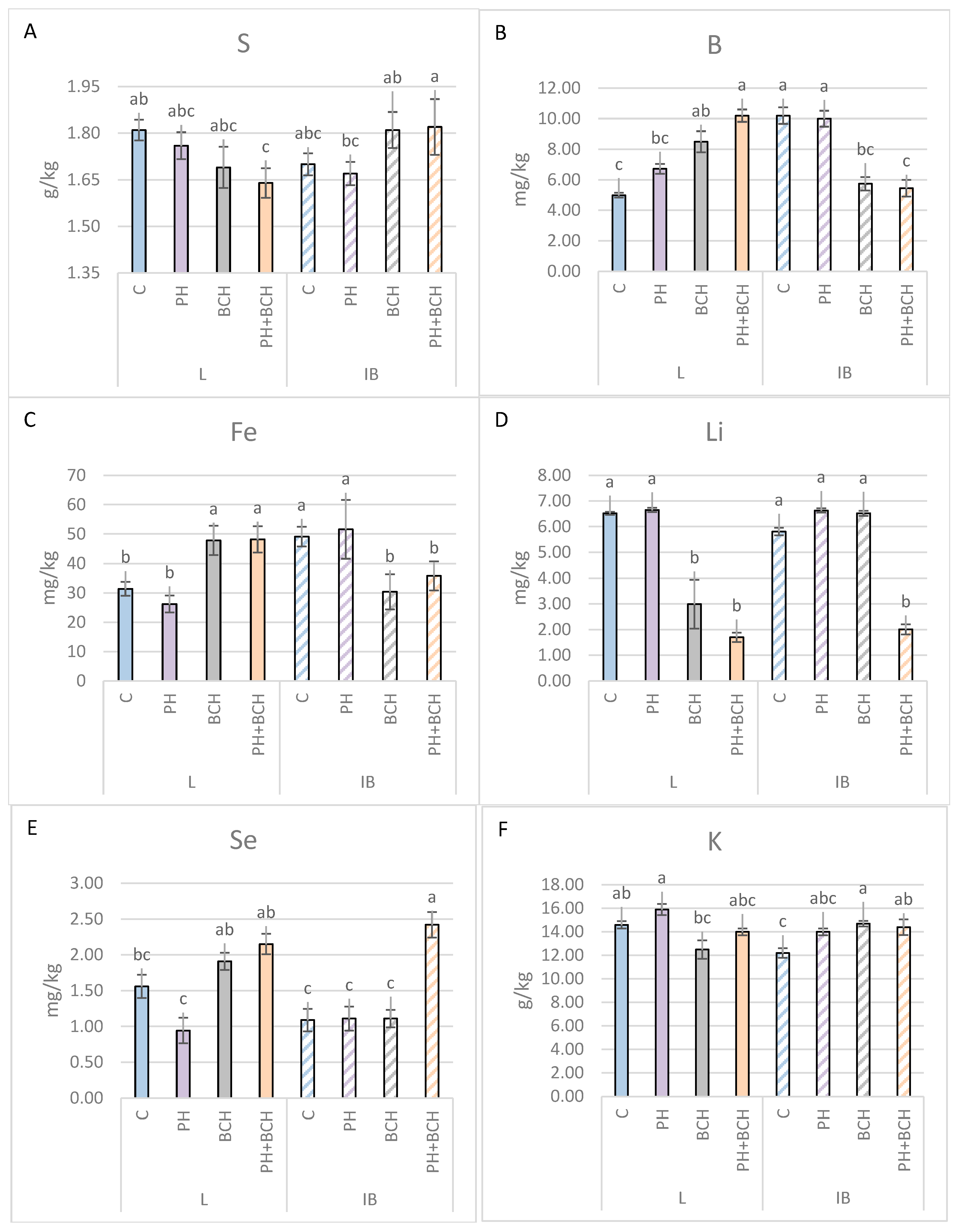 3.2. Effects of Biochar and/or Phenolic Extracts on Elemental Content in Olive Leaves