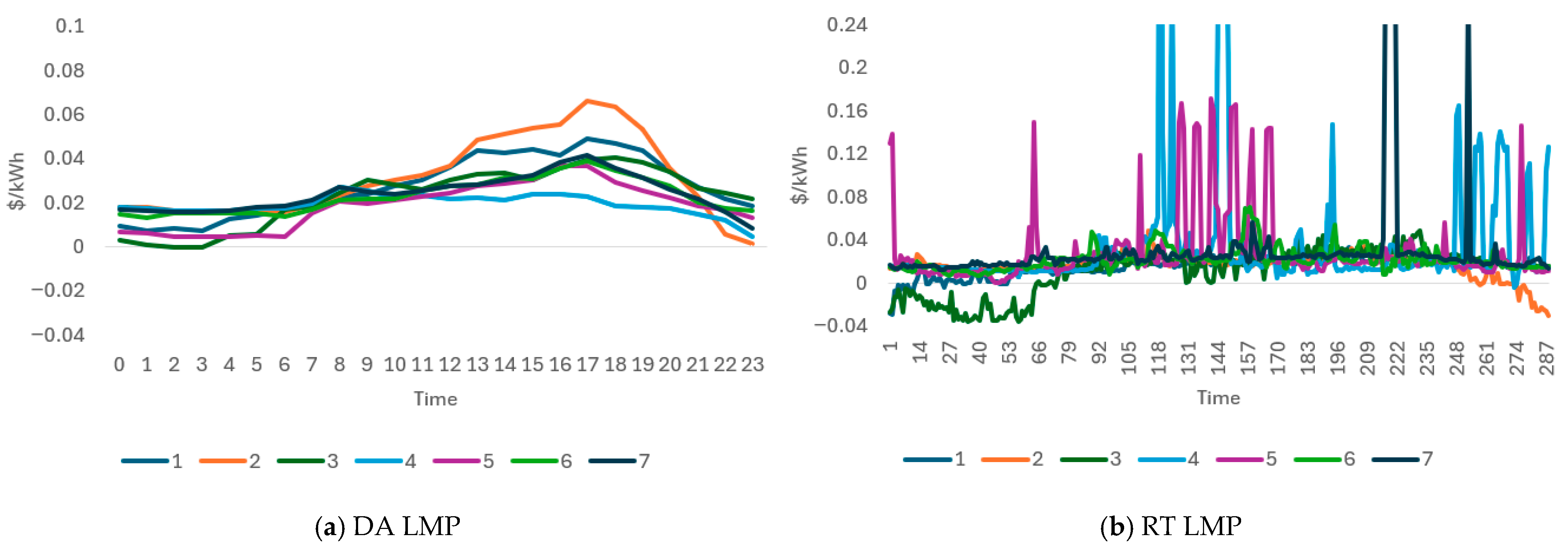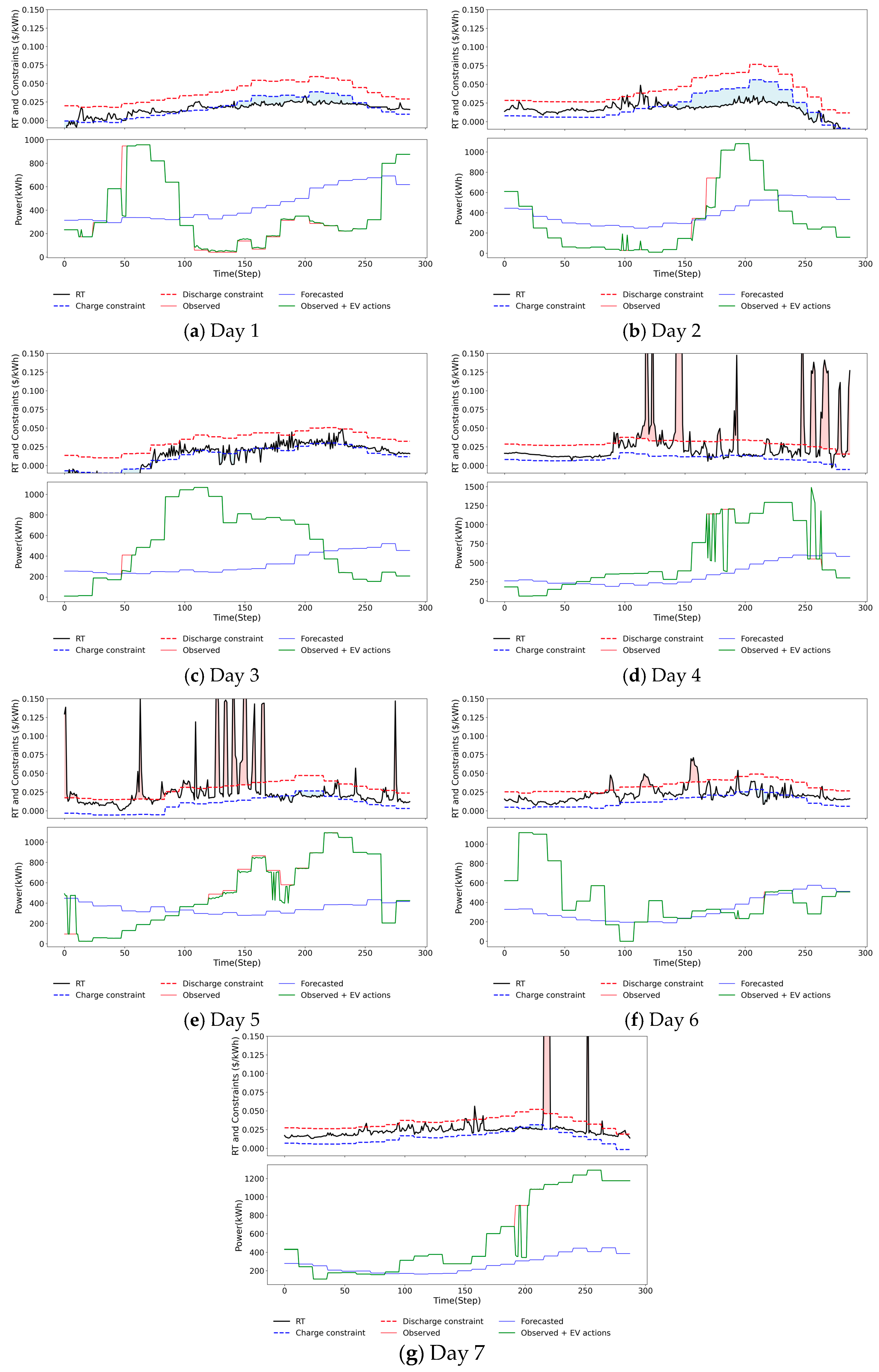 | Day | Baseline Net Revenue ($) | Net Revenue by Controlling EVs ($) | RT Optimization Net Revenue ($) | Battery Degradation Cost ($) | Discharging Power (kWh) | Charging Power (kWh) |