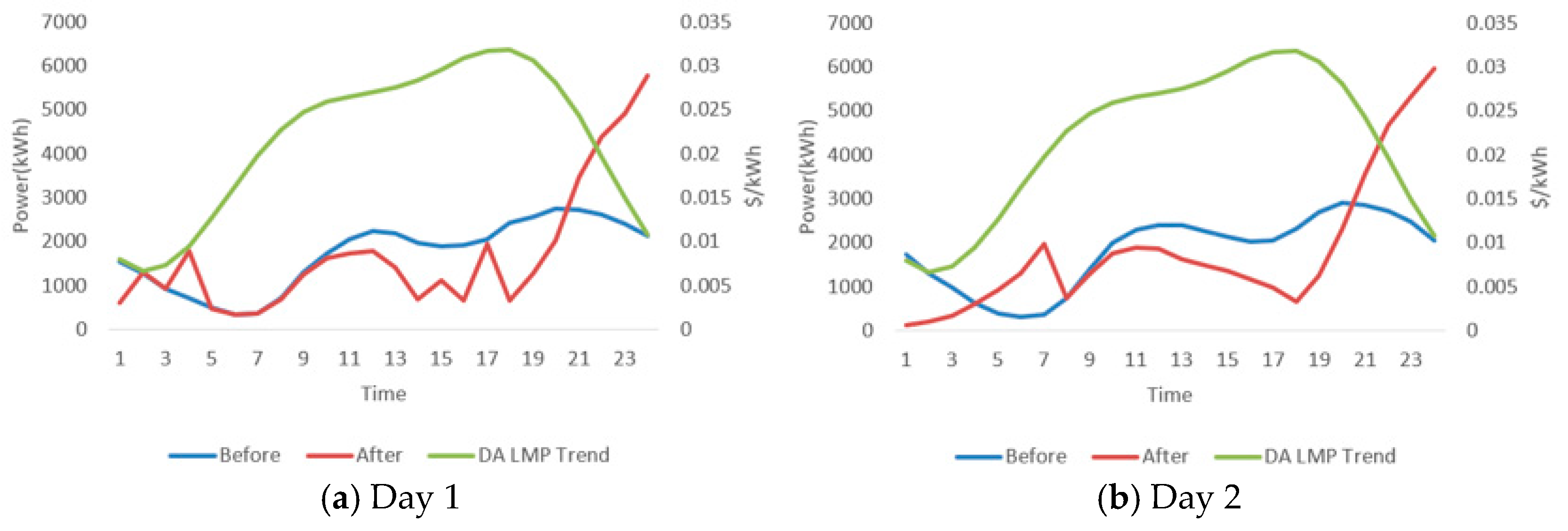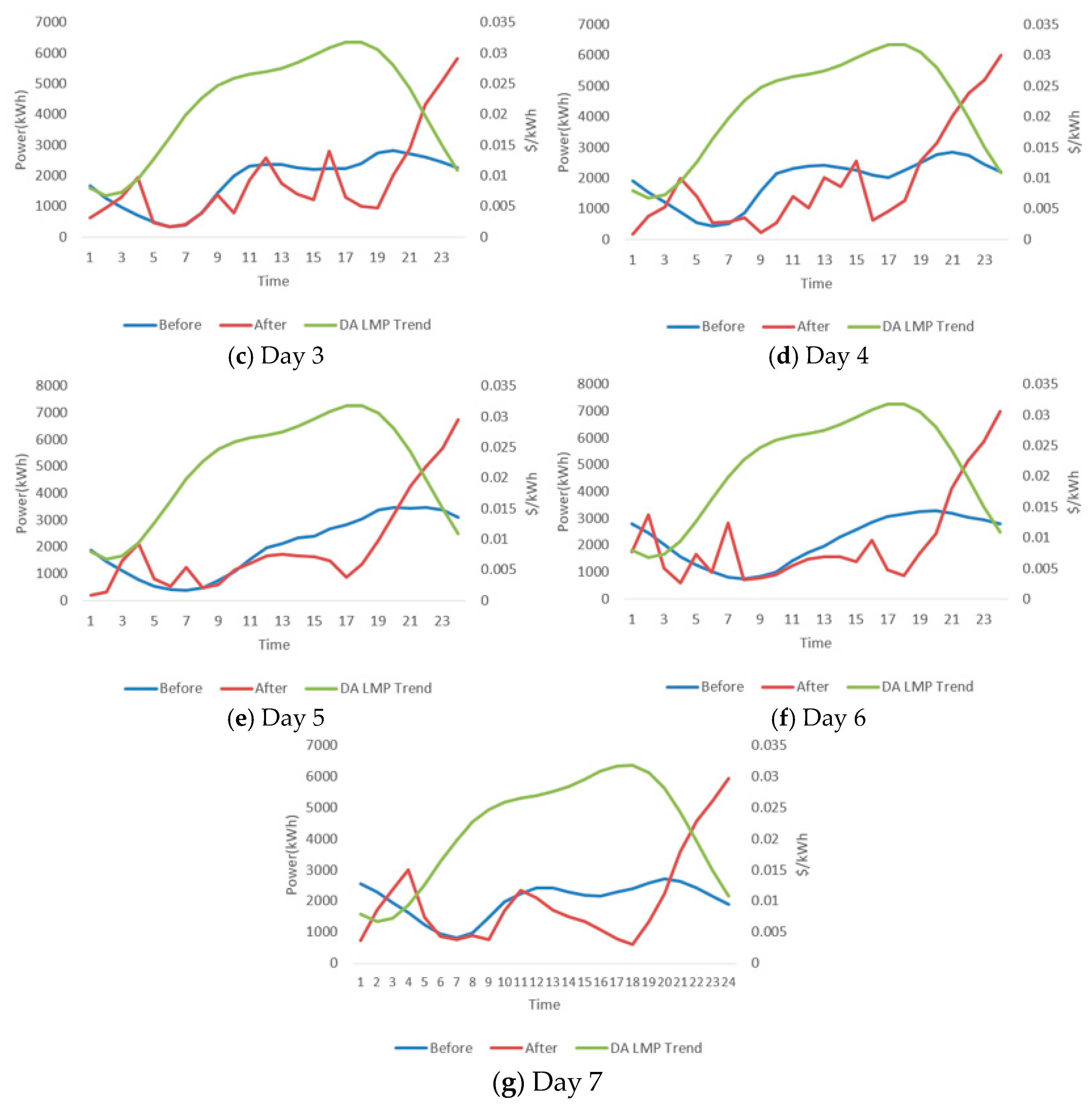| Day | Charging Demands (kWh) | Baseline Cost ($) | Cost Saving ($) | DA Optimization Cost ($) | Cost Reduction (%) |
