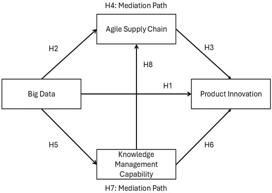 From a Knowledge-based View (KBV), knowledge management (KM) capabilities play a critical role in transforming sustainability-oriented big data analytics (BDA) into actionable insights that support product innovation [53,54]. BDA produces intensive, structured, and unstructured data, which can contribute to improving environmental and social performance if properly managed. Yet, the realisation of value from such capabilities is contingent on a firm’s capacity to access, assimilate, share, and utilise resources via knowledge management (KM), underscoring KM as a critical mediating dynamic capability between sustainable BDA and innovation outcomes [55,56].