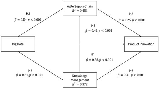 The Table 6 shows that the results of the structural model support the confirmation of all hypothesised direct relationships. Big data has a very significant positive direct impact on product innovation (β = 0.28, p < 0.001), knowledge management (β = 0.61, p < 0.001), and an agile supply chain (β = 0.54, p < 0.001). Knowledge management (β = 0.31, p < 0.001) and an agile supply chain (β = 0.25, p < 0.001) are both strongly positively correlated with product innovation. In addition, knowledge management has a positive effect on an agile supply chain (β = 0.41, p < 0.001). None of the path coefficients is insignificant, as all the critical ratios (t-values) are far beyond the 1.96 threshold, providing strong evidence for the theoretical framework. The 95% bootstrap confidence intervals for all paths do not include zero, thus confirming the robust nature of the relationships.