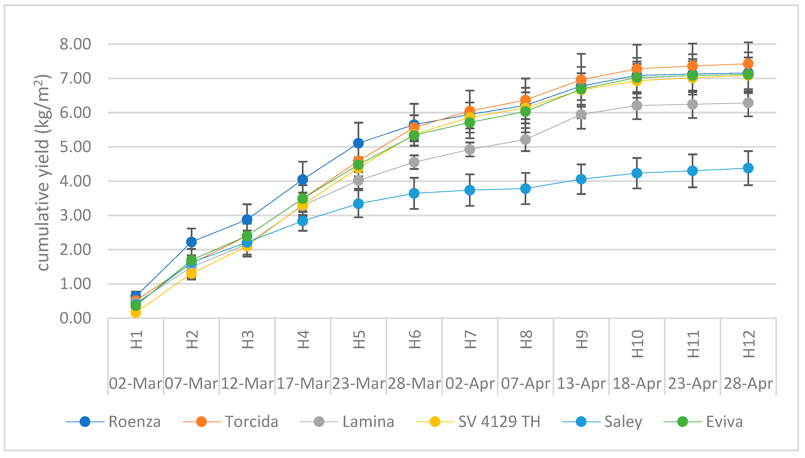 - Mid-season harvests (H4–H7, 12 March to 2 April): Moderate decline to about 60–70%, coinciding with reduced plant vigor and increasing fruit defects.