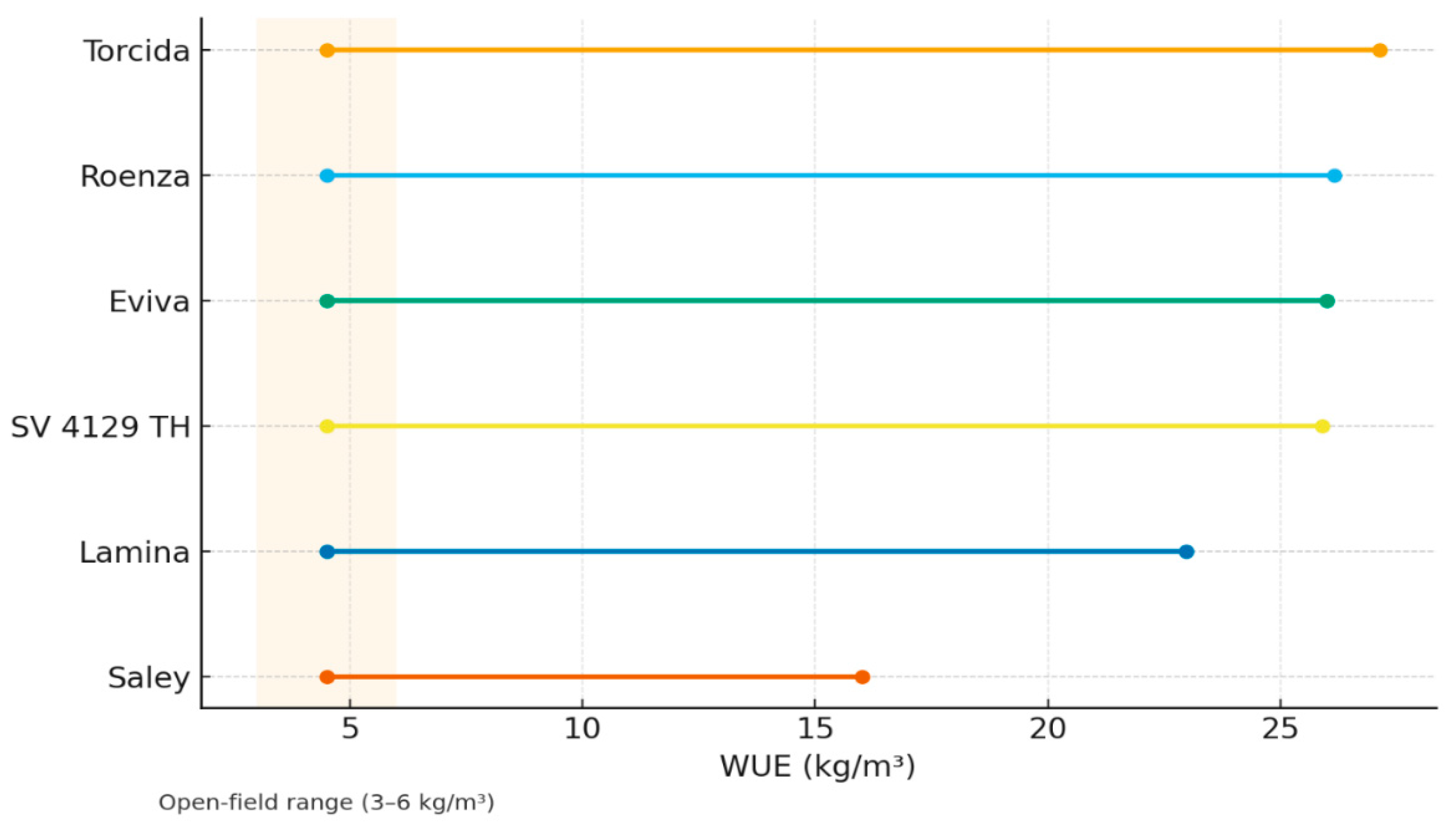 - Water-use efficiency (WUE): Calculated as the ratio of total marketable yield (kg) to total irrigation water applied (m3).