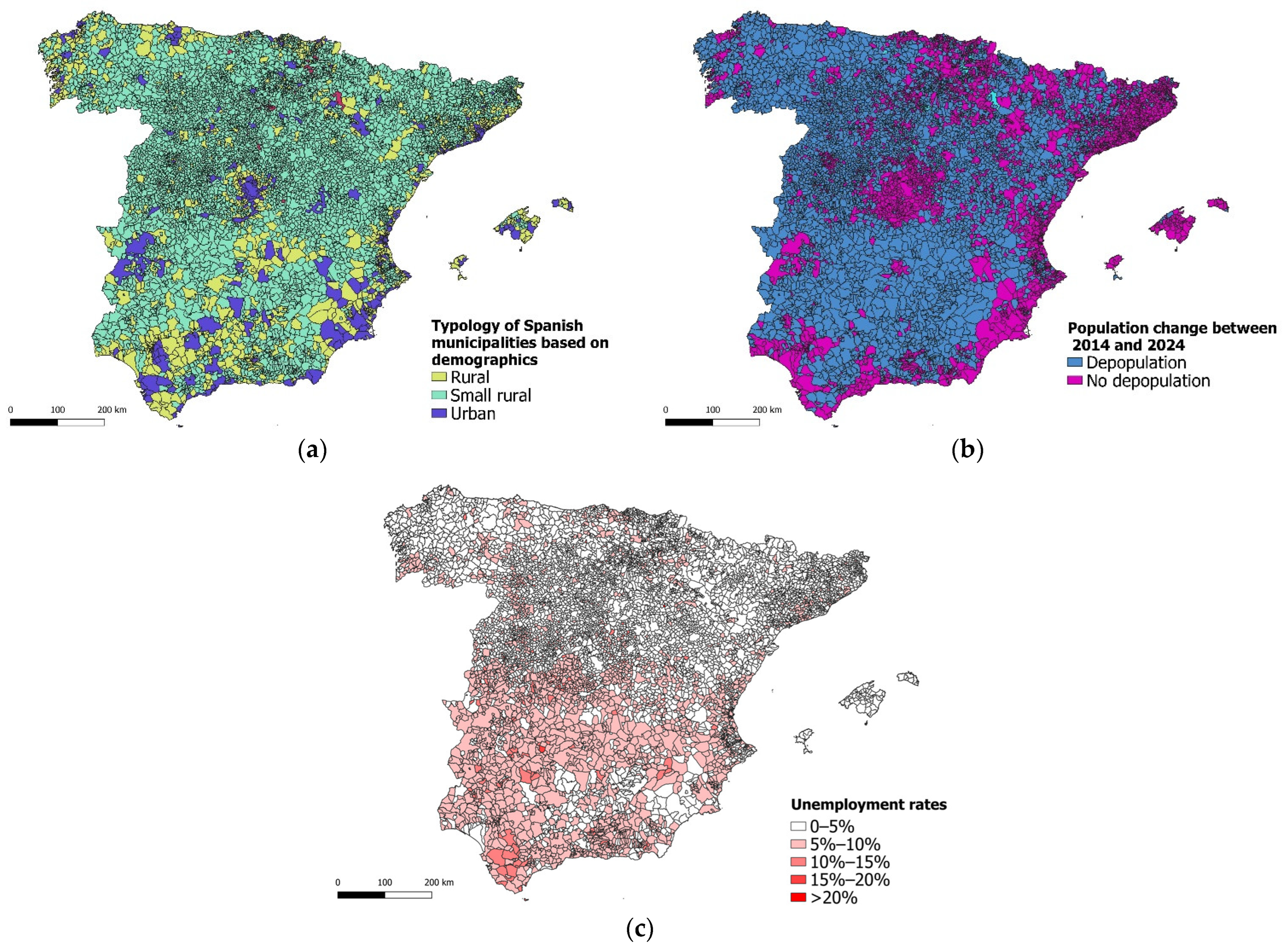 - Ministerio de Trabajo y Economía Social. Estadísticas Por Municipios (Paro Registrado y Contratos). Available online: https://www.sepe.es/HomeSepe/es/que-es-el-sepe/estadisticas/datos-estadisticos.html (accessed on 4 July 2025).