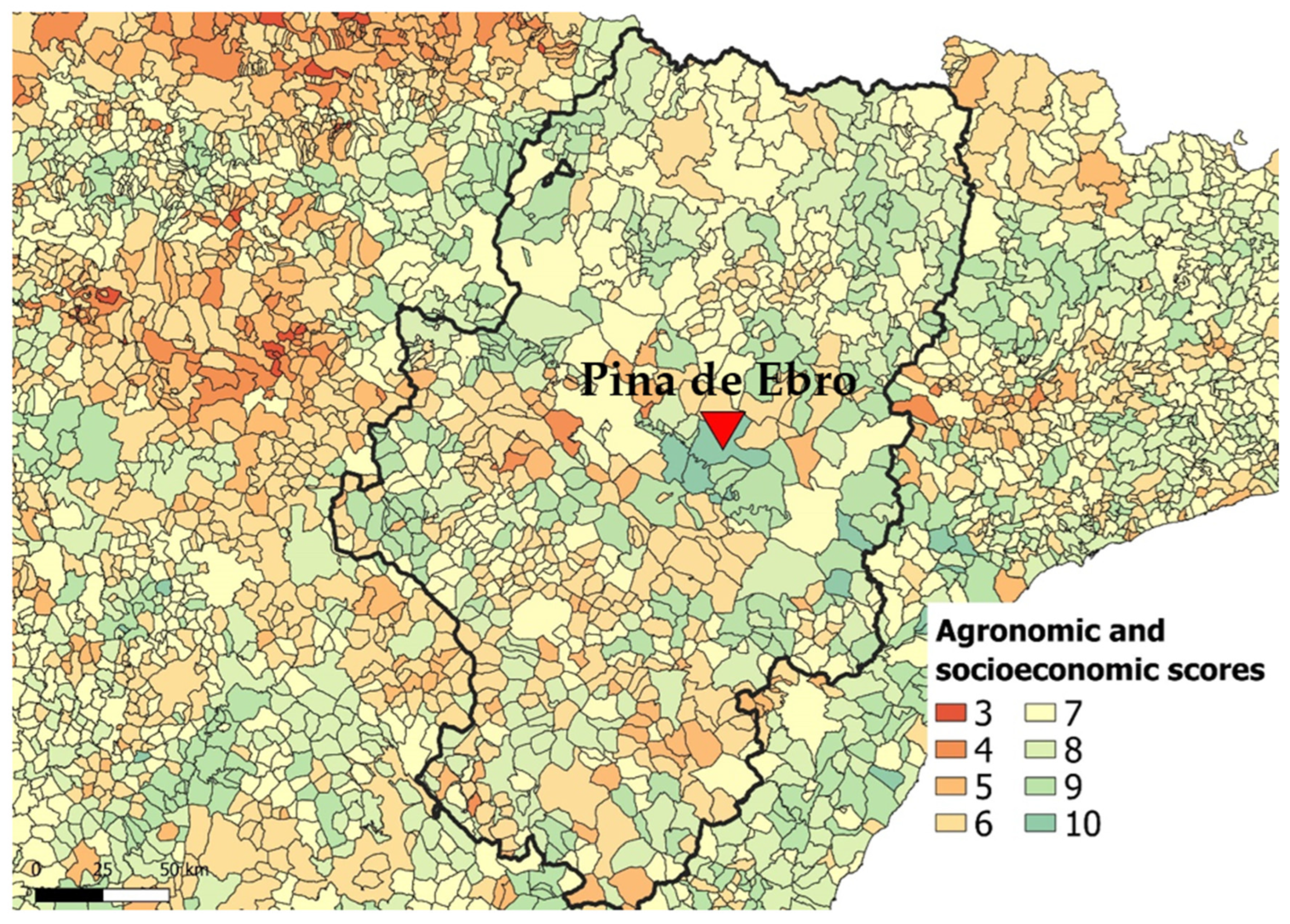 - Moderate-suitability areas (scores 7–9), where either the agronomic or social dimension is partially met.