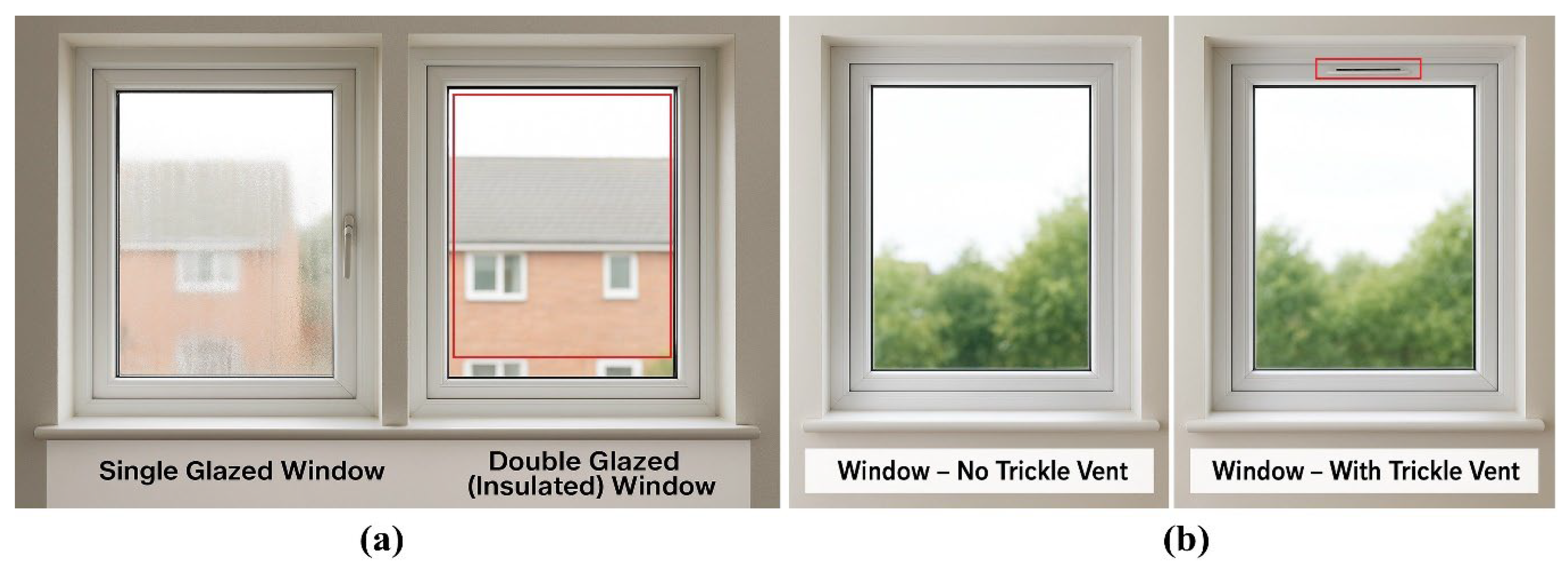 Figure 1b, the right panel compares a window without a trickle vent and a window with a trickle vent. The trickle vent, indicated in red, allows controlled ventilation by enabling small amounts of fresh air to enter the interior space, helping to reduce indoor humidity, prevent condensation, and improve indoor air quality without the need to open the window fully.