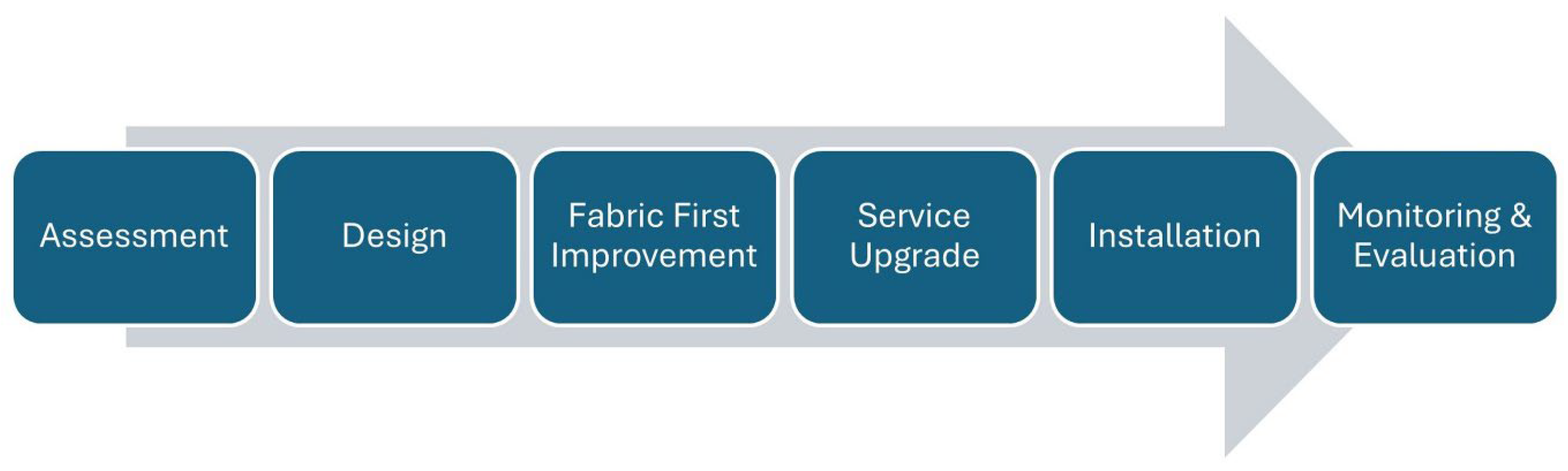 The whole-house retrofit approach represents a fundamental shift in how domestic energy efficiency interventions are designed and implemented. Unlike traditional, piecemeal retrofits that focus on individual measures in isolation, a whole-house approach considers the dwelling as an interconnected system, where the building fabric, services, and occupant behaviour interact. This methodology is essential for ensuring that retrofit interventions deliver the intended energy savings, improve comfort, and avoid unintended consequences such as moisture accumulation or overheating. The whole-house approach to retrofit is founded on key principles that ensure comprehensive, effective, and sustainable outcomes. It begins with a holistic assessment of all building components, e.g., walls, roofs, floors, windows, doors, and services, to understand their interconnections. Retrofit measures are carefully integrated so that improvements in insulation align with airtightness and ventilation strategies, preventing issues like condensation. A lifecycle perspective is also essential, focusing on long-term durability, comfort, and reduced maintenance rather than short-term energy savings alone. Crucially, the approach remains occupant-centred, tailoring interventions to the needs, behaviour, and comfort preferences of residents to ensure that solutions are both practical and user-friendly. At the core of the whole-house retrofit concept is the fabric-first approach, which focuses on enhancing the building envelope before implementing mechanical or renewable energy systems. This philosophy aims to minimise heat loss, improve energy efficiency, and ensure long-term building performance by addressing inefficiencies directly within the fabric of the structure. Walls are a primary focus, with solid walls upgraded through internal or external insulation depending on space, appearance, and heritage constraints, while cavity walls are insulated with careful consideration of moisture control and cold bridging prevention. Roofs and lofts are also vital areas for intervention, where adequate insulation and controlled ventilation reduce vertical heat loss and prevent condensation-related damage. Floors, particularly suspended timber ones, are insulated to limit drafts and heat loss, while solid floors may incorporate rigid insulation or underfloor heating during extensive retrofits.