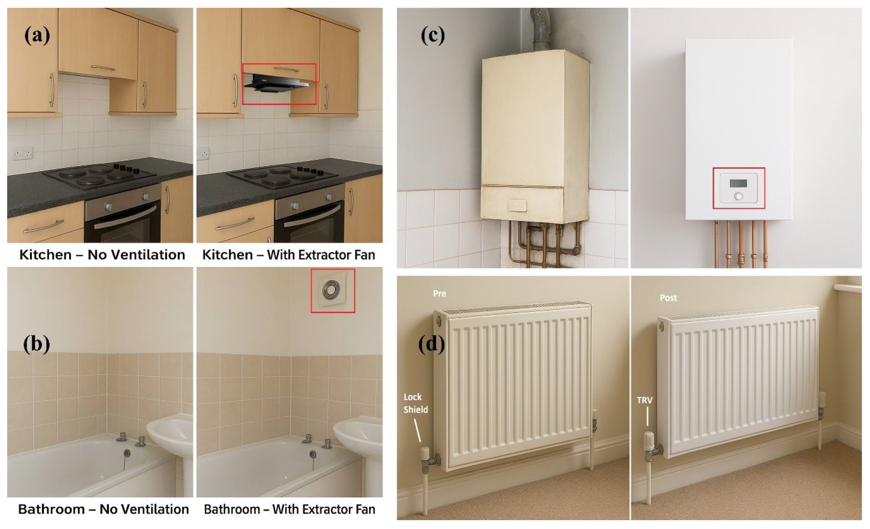 Figure 3 illustrates the implementation of targeted ventilation and heating controls as critical components of a holistic retrofit strategy. The figure contrasts pre- and post-retrofit conditions in key household areas, e.g., (a) kitchen, (b) bathroom, (c) boiler area, and (d) common room, respectively, lacking mechanical ventilation, a state that promotes poor indoor air quality, moisture accumulation, and mould growth. The retrofit solution, shown in panels, addresses this by installing extractor fans, which actively expel humid air and contaminants, thereby safeguarding the building fabric and occupant health. Furthermore,