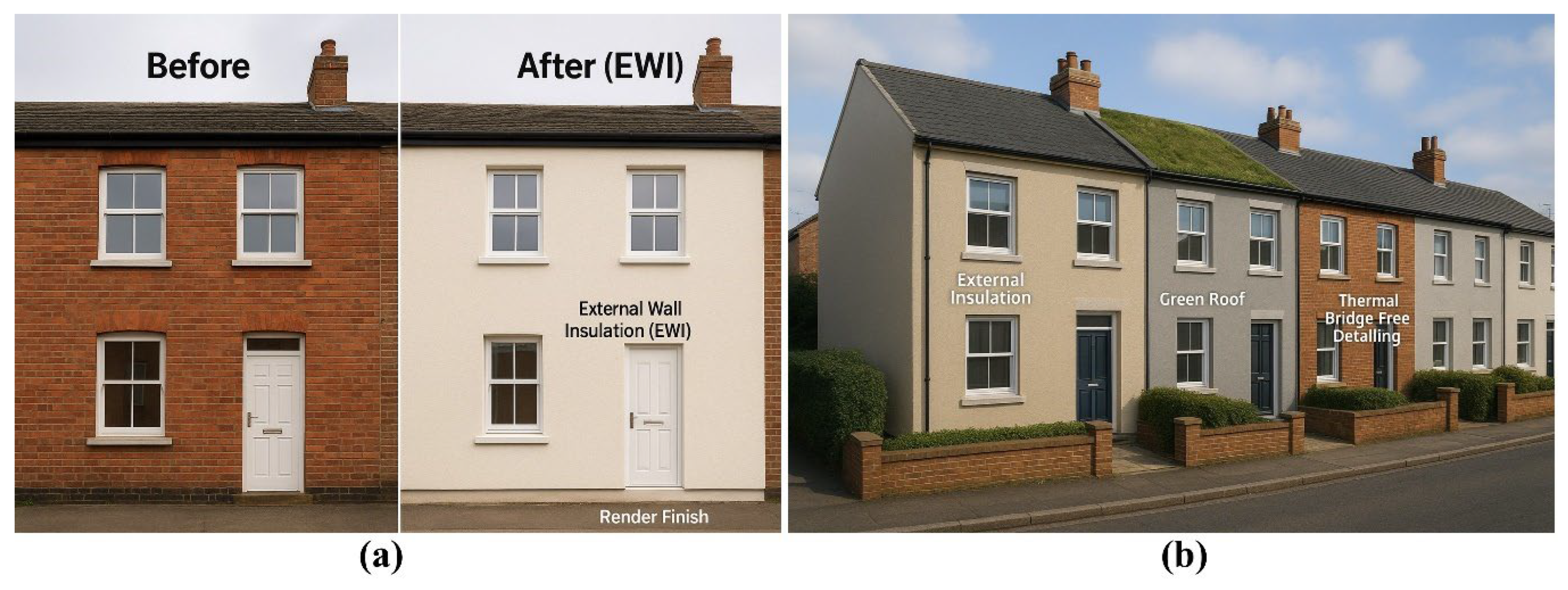 82]. By integrating these three strategies, continuous insulation, careful junction detailing and thermal breaks, a retrofit designer can substantially improve the performance of the upgraded fabric, reduce the risk of condensation/mould growth, and ensure that energy performance gains are realised in use.