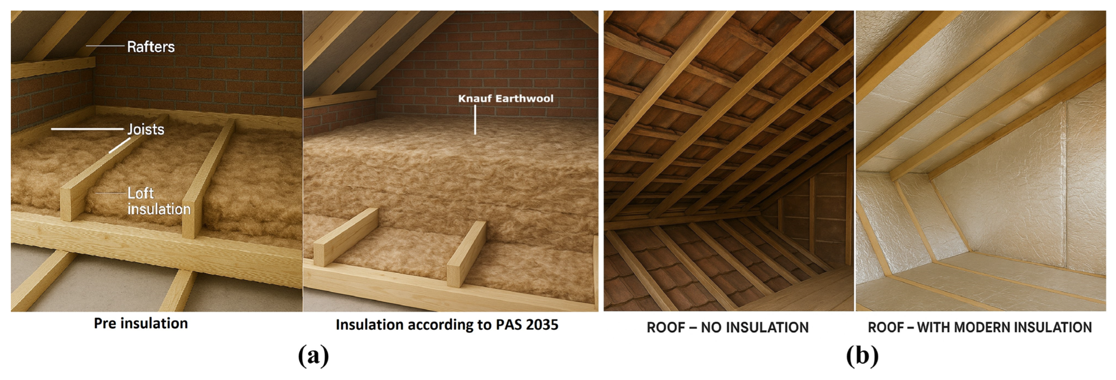 32]. Specialist dwellings, e.g., flats, terraces, and high-rises, pose unique retrofit challenges due to shared structures and ventilation complexities. Regional differences further influence retrofit needs, with northern areas typically facing higher heating demands due to older housing and colder climates, while southern areas exhibit more modern, electrically dependent homes with distinct energy use profiles. Solid walls are inherently less thermally efficient than cavity walls, requiring internal or external insulation to reduce heat loss. Roofs range from pitched tiled designs to flat concrete constructions. Loft insulation is highly variable, particularly in older homes. Suspended timber floors are common in Victorian homes, which are prone to heat loss and moisture problems. Solid floors are easier to insulate during major retrofits. Single-glazing is prevalent in older stock, whereas modern homes generally feature double or triple glazing. Poor window positioning can exacerbate overheating or heat loss. Older homes often rely on inefficient gas or electric heating, while modern homes integrate high-efficiency boilers, heat pumps, or hybrid systems. The interaction between these factors defines the baseline energy performance of each dwelling and informs the selection of appropriate retrofit measures, including insulation, air tightness, ventilation, and heating system upgrades [