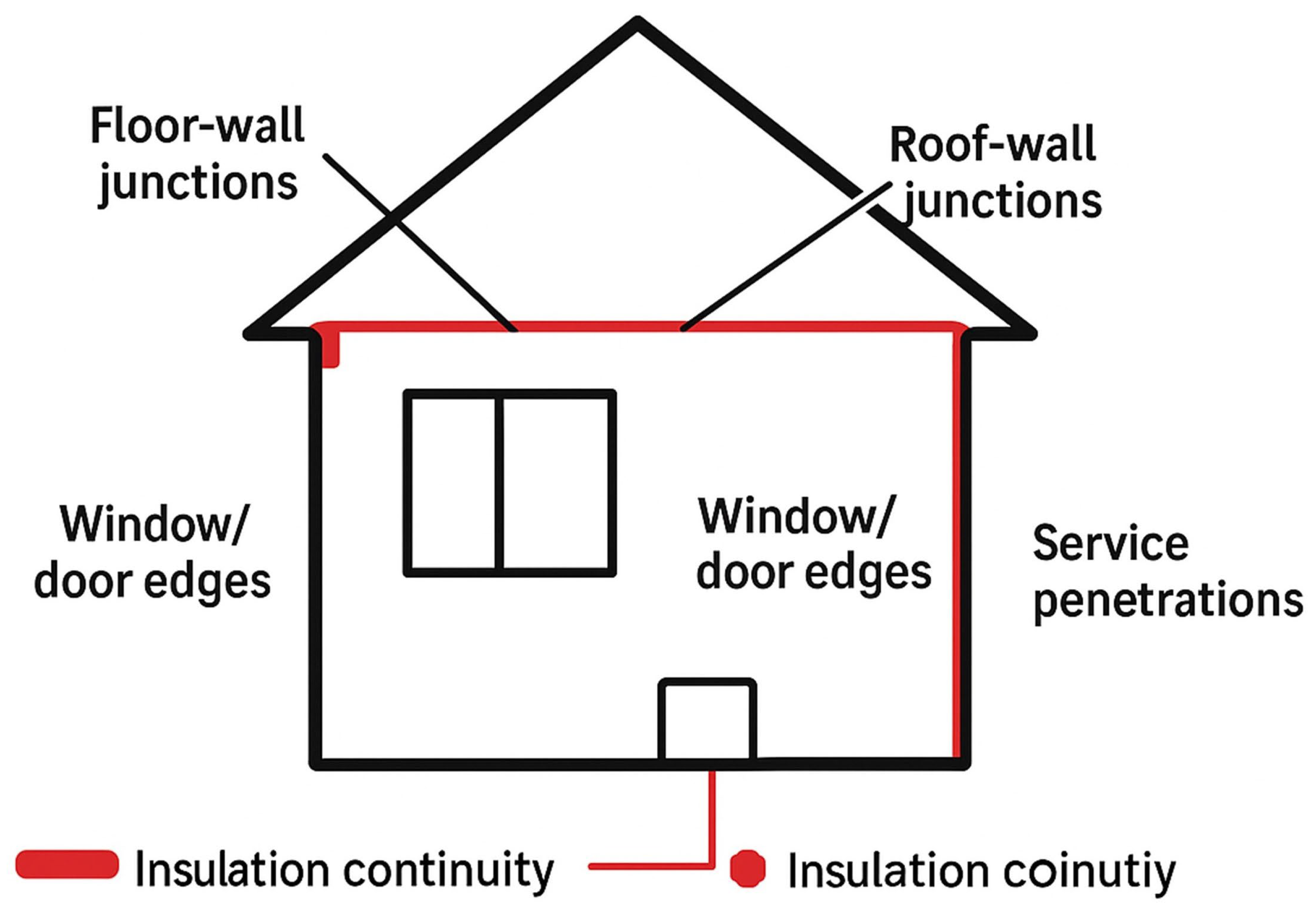 81]. Post-installation verification is essential to confirm that TB mitigation strategies perform as intended and that energy efficiency, comfort, and durability targets are achieved. Effective mitigation of TB is indispensable to ensuring that insulation upgrades in whole-house retrofit projects deliver their intended performance and avoid moisture-related problems. The deployment of continuous insulation, an uninterrupted layer of insulation applied externally or internally over the thermal envelope, minimises heat loss by closing gaps and eliminating weak paths; for example, modelled studies in UK solid-wall dwellings showed that uninterrupted insulation coverage reduced junctions with critically low internal surface temperatures from ~16–22% down to ~1–8%. At the same time, meticulous junction detailing at eaves, lintels, wall-floor bases, and window/door reveals, is essential. Research highlights how lintels and floor-to-wall joints, if left un-broken, can account for significant extra heat loss and become condensation sites [