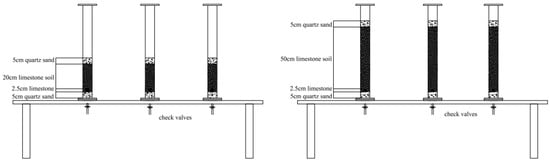 Figure 2 illustrates a schematic representation of the experimental configuration. The experiment utilized a PVC column measuring 75 cm in height and 7.5 cm in inner diameter. Prior to the experiment, one group of columns was sequentially filled from top to bottom with the following materials: 5 cm of quartz sand, a 20 cm-thick soil sample (comprising calcareous soil mixed with various chemical fertilizers), limestone fragments (dimensions: 2 cm × 1 cm × 0.5 cm), an additional 5 cm of quartz sand, and circular qualitative filter paper. The remaining group of columns was filled similarly, with the calcareous soil layer measuring 50 cm in thickness. Solutions were consistently introduced into the dissolving columns, comprising chicken manure fertilizer solution (100 g of chicken manure dissolved in 1000 mL of water) and compound fertilizer solution (100 g of compound fertilizer dissolved in 1000 mL of water). In the initial 10 days (Days 0–10), a cumulative volume of 1000 mL of the designated fertilizer solution (chicken manure fertilizer solution for columns treated with chicken manure and compound fertilizer solution for columns treated with compound fertilizer) was incrementally administered to the respective fertilizer-amended soil columns, while 1000 mL of tap water was supplied to the control soil columns. Between Day 10 and Day 50, a cumulative volume of 4000 mL of tap water was incrementally introduced to each column.