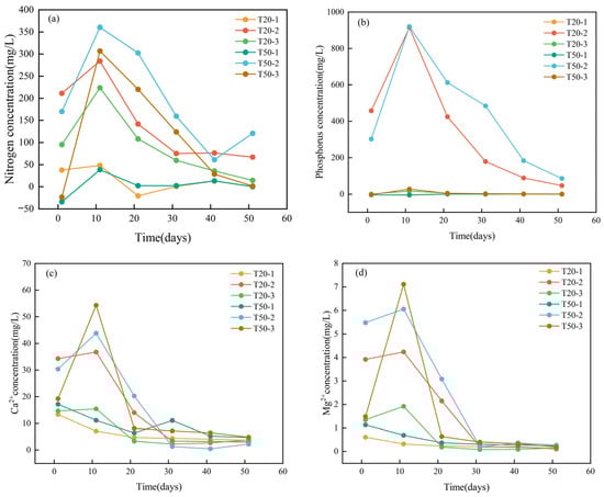 Figure 3a–d depict the fluctuations in concentrations of nitrogen, phosphorus, Ca2+, and Mg2+ in the leachate from various soil columns. The nitrogen concentration in the 50 cm soil column exceeded that of the 20 cm column, whereas the phosphorus concentration in the compound fertilizer column was markedly greater than in the chicken manure column, with maximum values of 920.6 mg/L and 27.9 mg/L, respectively—a disparity exceeding 30-fold. The disparity in nitrogen concentration between the two was quite minor. The amounts of nitrogen (N) and phosphorus (P) peaked on the 10th day and thereafter declined as the frequency of tap water leaching episodes increased. In the compound fertilizer treatment, the nitrogen concentration increased with the application of the fertilizer solution, peaking on the 10th day, and thereafter declined throughout the clear water leaching phase. The maximum value of T50–2 was markedly greater than that of T20–2, and its concentration consistently exceeded that of T20–2 during the decline phase. This suggests that the augmentation of soil depth may facilitate the collection or retention of nitrogen and postpone its leaching process. In Column T50–2, the nitrogen content on the 50th day exhibited a marginal rise relative to that on the 40th day. The likely explanation for this is the increased soil content in this column: a portion of the nitrogen was adsorbed onto the surfaces of soil particles, and furthermore, the leachate did not completely permeate the soil layer. The two variables resulted in the desorption of nitrogen, which then entered the leachate in the later stage.