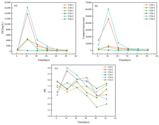 The change in ion concentration in the exudate: (a) total alkalinity (HCO3− concentration), (b) electrical conductivity, (c) pH.