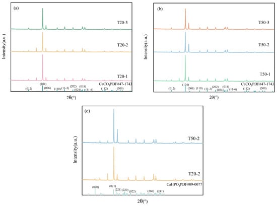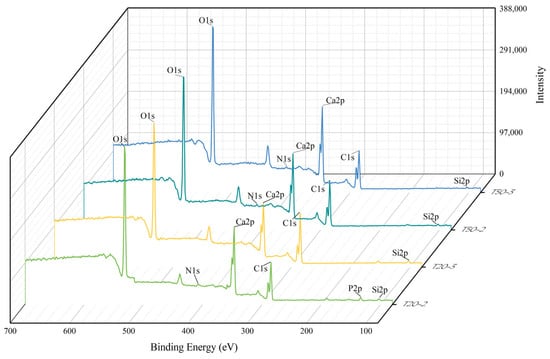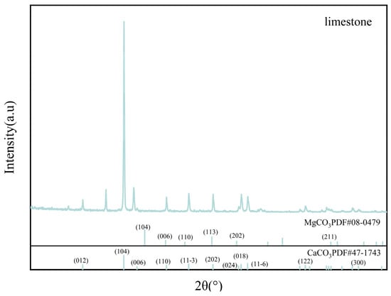 The limestone slices were collected, classified, and subsequently dried in an oven at 105 °C for 24 h following the trials. A little quantity of each sample was thereafter extracted and pulverized in a ceramic mortar for ensuing microscopic characterization examinations. The test results were evaluated utilizing MDI JADE 6 software and Origin 2023. The crystal structure, phase composition, and internal structure of the materials were examined utilizing an X-ray diffractometer (XRD, PANalytical B.V., X’Pert3 Power, Almelo, The Netherlands). The instrument’s operational characteristics were: CuKα radiation (45 kV, 40 mA), a scanning rate of 10°/min, and a scanning range from 10° to 90° [31]. Analytical reagent-grade (99.9%) KBr from Xilong Scientific was utilized as the infrared absorption backdrop. The sample and KBr were combined in an agate mortar at a ratio of 1:100, subsequently undergoing meticulous grinding and mixing. A suitable quantity of the mixture was placed into a tablet pressing mold and compressed at a pressure of 20 MPa for 10–20 s using a tablet press to produce a translucent thin sheet. A Fourier transform infrared spectrometer (FT-IR, Thermo Fisher Scientific, Nicolet™, Waltham, MA, USA) was utilized to examine the structural modifications of the functional groups inside the material. The specifications and technical parameters of the utilized Fourier transform infrared spectrometer were iS10, with a scanning range established at 4000–400 cm−1 [32]. A monochromatic Al Kα (1486.6 eV) X-ray source was employed in a Thermo Fisher K-Alpha X-ray photoelectron spectrometer (XPS, Thermo Fisher, K-Alpha, USA) to irradiate the material. This irradiation stimulated the emission of inner-shell or valence electrons from atoms or molecules. The kinetic energy of the photoelectrons was measured to acquire information on the sample’s elemental composition and the binding energies of its chemical bonds. For full-spectrum acquisition, the pass energy was established at 100 eV with a step size of 1 eV; for narrow-spectrum acquisition, the pass energy was set to 20 eV with a step size of 0.1 eV. The vacuum level for the experiment was 10−19 mbar, and all recorded sample spectra were calibrated utilizing the standard contamination peak of C 1s (binding energy, BE = 284.8 eV) [33]. The surface micromorphology of limestone was examined utilizing a scanning electron microscope (SEM, GeminiSEM 300, Carl Zeiss AG, Oberkochen, Germany). An energy dispersive spectrometer (model: Ultim Max, Oxford Instruments plc, Abingdon, United Kingdom) was integrated with the SEM to examine the elemental composition. The test parameters were established as follows: an accelerating voltage of 1.5 kV, a current of 5 nA, and a working distance (WD) of roughly 10 mm. Before testing, the sample was secured on the sample stage with conductive tape, and loose surface powder was removed using an air gun. A gold-spraying treatment was administered to the sample’s surface for 30 s to improve its conductivity. Upon positioning the sample in the sample chamber, the accelerating voltage, brightness, and magnification were calibrated. The auto-focus mode was employed to eradicate image blurriness, resulting in the acquisition of clean images and Energy Dispersive Spectroscopy (EDS) spectral data in both rapid and slow scanning modes [34].