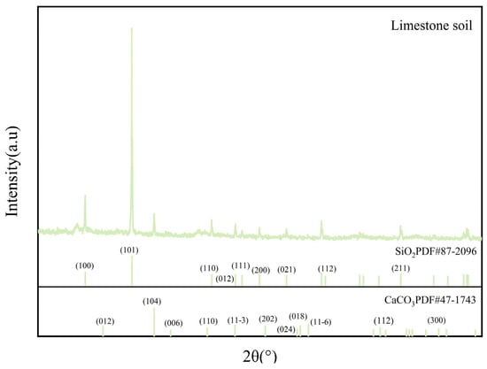 X-ray diffraction (XRD) utilizing MDI Jade6 software was applied to investigate the surface sediments of limestone and limestone soil prior to the experiment. Obtain the XRD reference spectrum. The findings (Figure 5 and Figure 6, and Table 3) demonstrate that the principal constituent of limestone is calcium carbonate, accompanied by a modest presence of magnesium carbonate, whereas limestone soil is chiefly comprised of silicon dioxide with trace levels of calcium carbonate.
