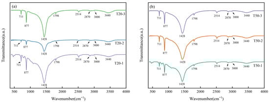 FT-IR analysis was utilized to ascertain alterations in the functional groups on the limestone surfaces under various treatment conditions. The findings are illustrated in Figure 8. Absorption bands in the range of 2870–3000 cm−1 and at 3440 cm−1 are ascribed to the stretching vibrations of surface hydroxyl groups (–OH) [41]. The characteristic bands at 711 cm−1, 877 cm−1, and 1428 cm−1 are all associated with calcium carbonate. The bands at 711 cm−1 and 877 cm−1 correspond to the in-plane and out-of-plane bending vibrations of C–O, respectively [42,43], respectively, while the peak at 1428 cm−1 arises from the asymmetric stretching vibration of C=O in CO32− [44], thereby affirming that the primary mineral component of the limestone is CaCO3. At an equivalent soil column height, the absorption band of limestone subjected to the compound fertilizer treatment at 1428 cm−1 exhibited a narrowing. The absorption band of limestone in the compound fertilizer column at 1428 cm−1 is narrower than that in the chicken manure fertilizer column and the blank column, indicating a more pronounced dissolving impact. In conclusion, despite alterations in the chemical composition of the aqueous components in the leachate, the primary functional group structure of the limestone medium remains unchanged, and no new functional groups have formed.