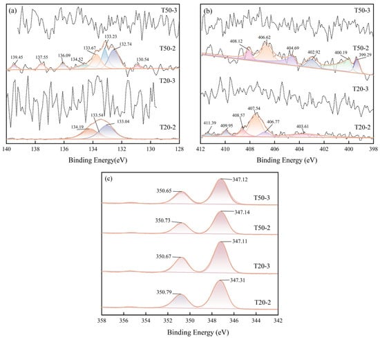 Figure 10a illustrates the P 2p narrow spectrum, revealing three peaks in sample T20–2 with binding energies of 133.54 eV, 134.19 eV, and 133.04 eV. The peaks at 134.19 eV and 133.04 eV correspond to P 2p3/2 and P 2p1/2, respectively [45], signifying the existence of phosphate species such as HPO42− (134.0 eV) and PO43− (133.0 eV) on the limestone surface. In sample T50–2, seven peaks were identified, and their binding energy positions further corroborate that PO43− (132.74 eV, 133.23 eV) is the predominant species [46]. The variations in phosphate binding energy among several experimental groups indicate that phosphate interacted with Ca2+ to produce Ca–P (e.g., calcium hydrogen phosphate) precipitates. Despite the observation of many peaks in the chicken manure column, the spectral noise was substantial; hence, these signals will not be further addressed.