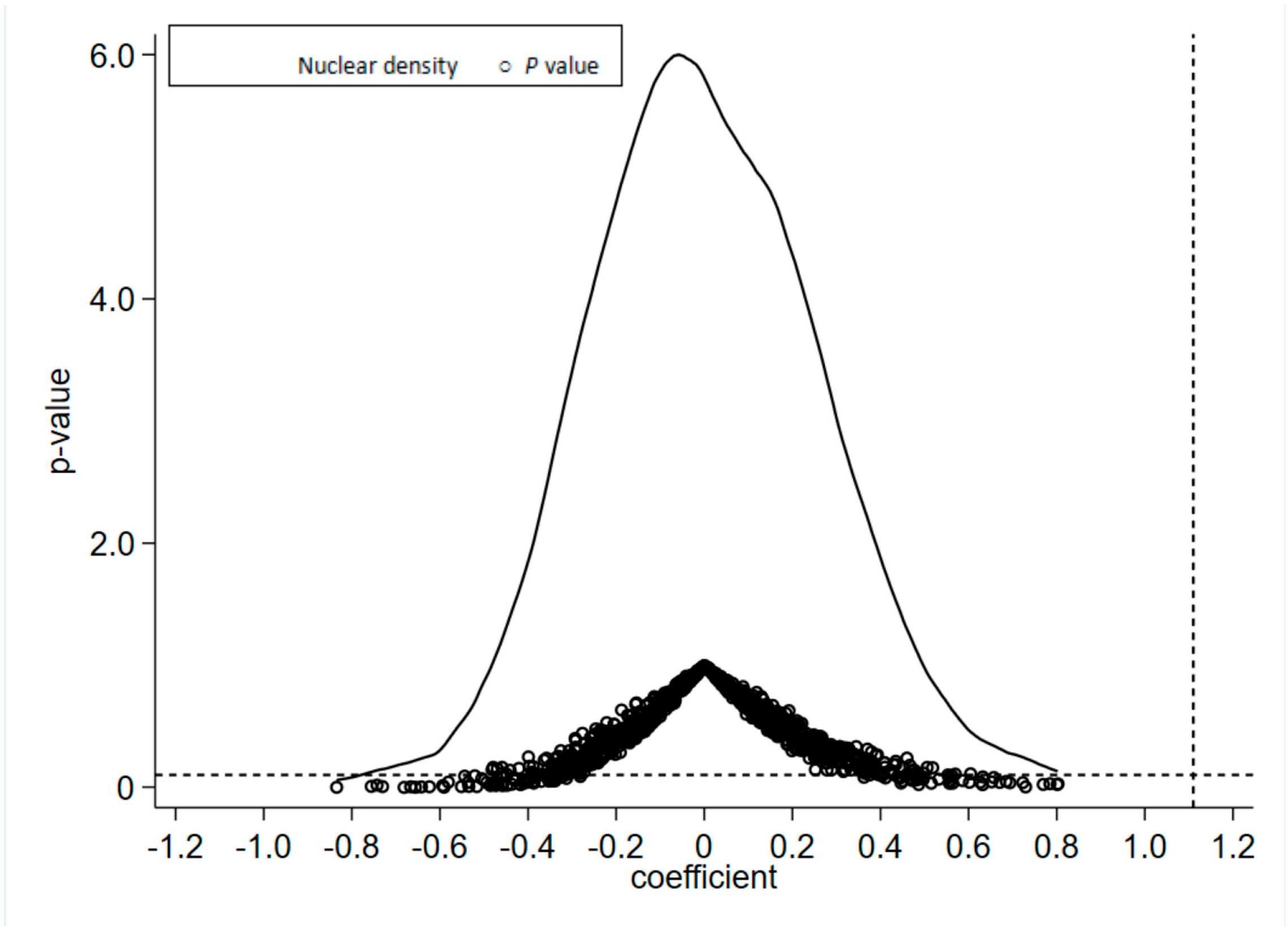 To validate the benchmark findings, a placebo test is conducted in which cities are randomly reassigned to the treatment group. It redefines the experimental and control groups for the water rights trading pilot program, uses the net carbon sink intensity of the urban planting industry as the dependent variable, and performs random sampling with 1000 repeated estimations. As shown in Figure 2, the estimated coefficients from the random simulation are largely concentrated around zero, which is quite different from the actual estimated value of 1.110, and approximately follow a normal distribution. Moreover, most p-values exceed 0.1. These results indicate that omitted variables do not significantly affect the regression results, and the benchmark regression is robust.
