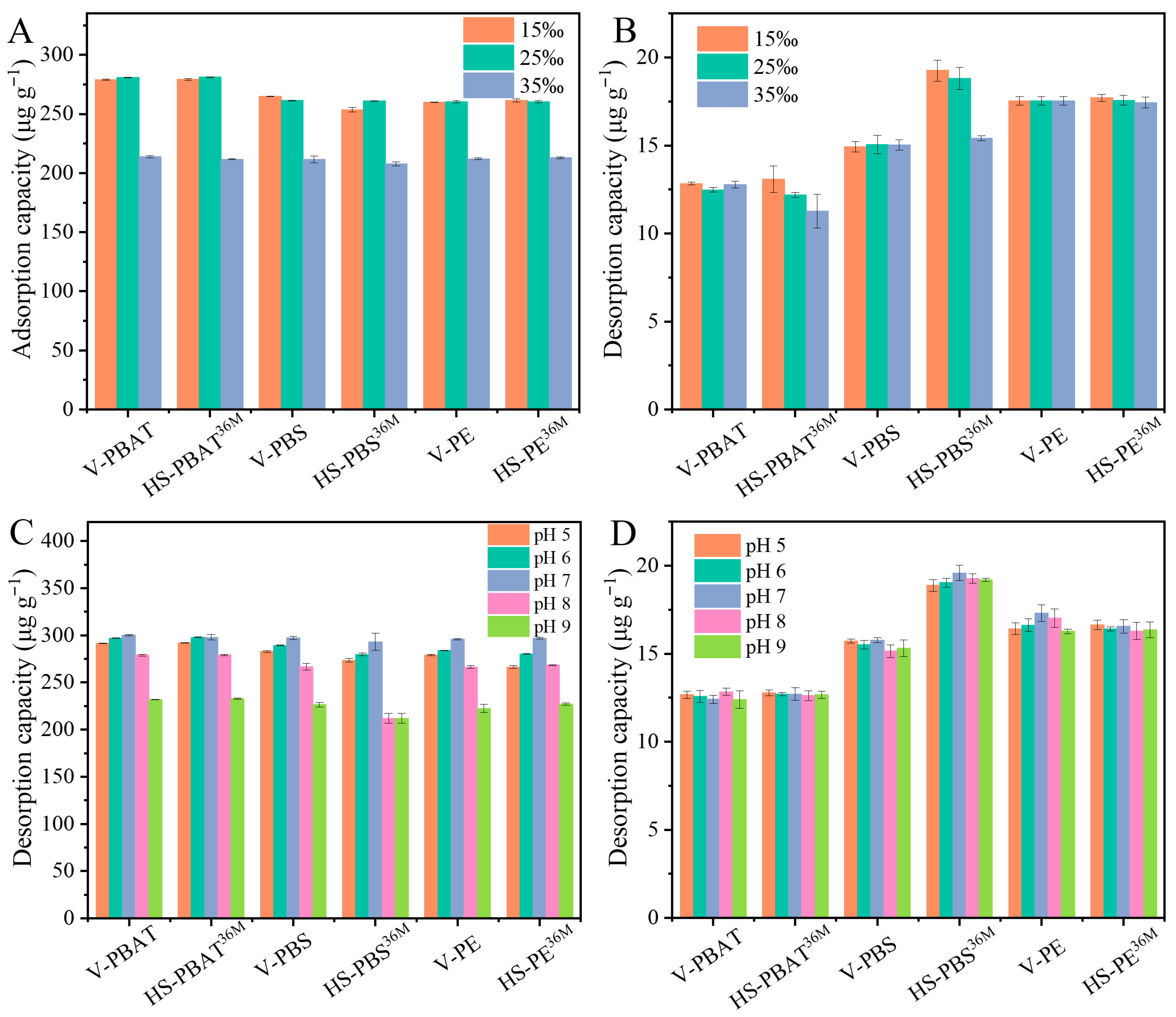 - Feng, Y.; Hua, W.; Lu, J.; Wu, J.; Zhang, C. Adsorption and desorption of nonylphenol on the biodegradable microplastics in seawater. J. Clean. Prod. 2024, 476, 143778. [Google Scholar] [CrossRef]