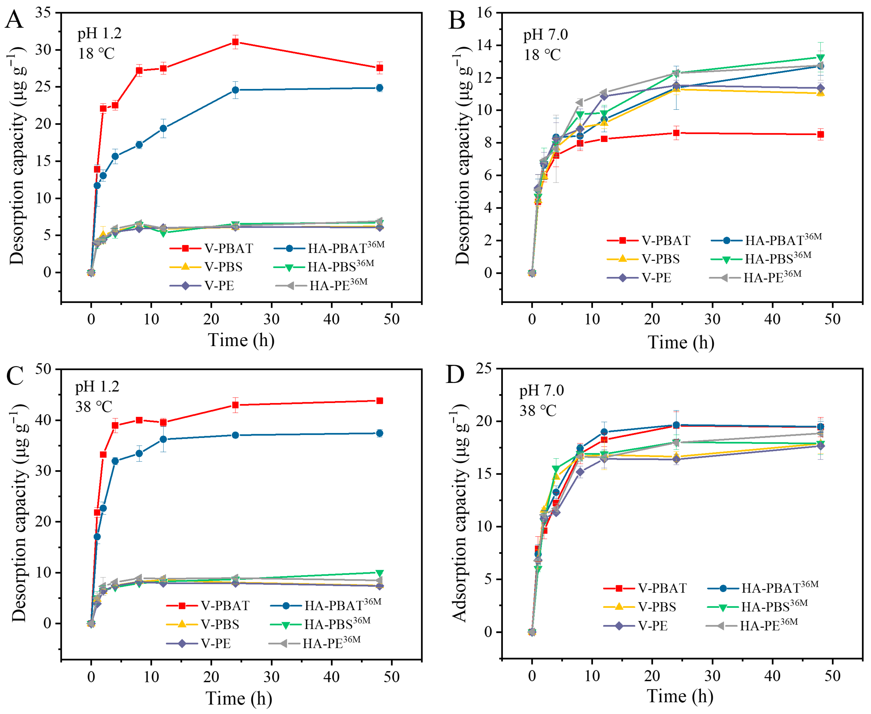 - Wu, J.; Lu, J.; Wu, J. Effect of gastric fluid on adsorption and desorption of endocrine disrupting chemicals on microplastics. Front. Environ. Sci. Eng. 2021, 16, 104. [Google Scholar] [CrossRef]