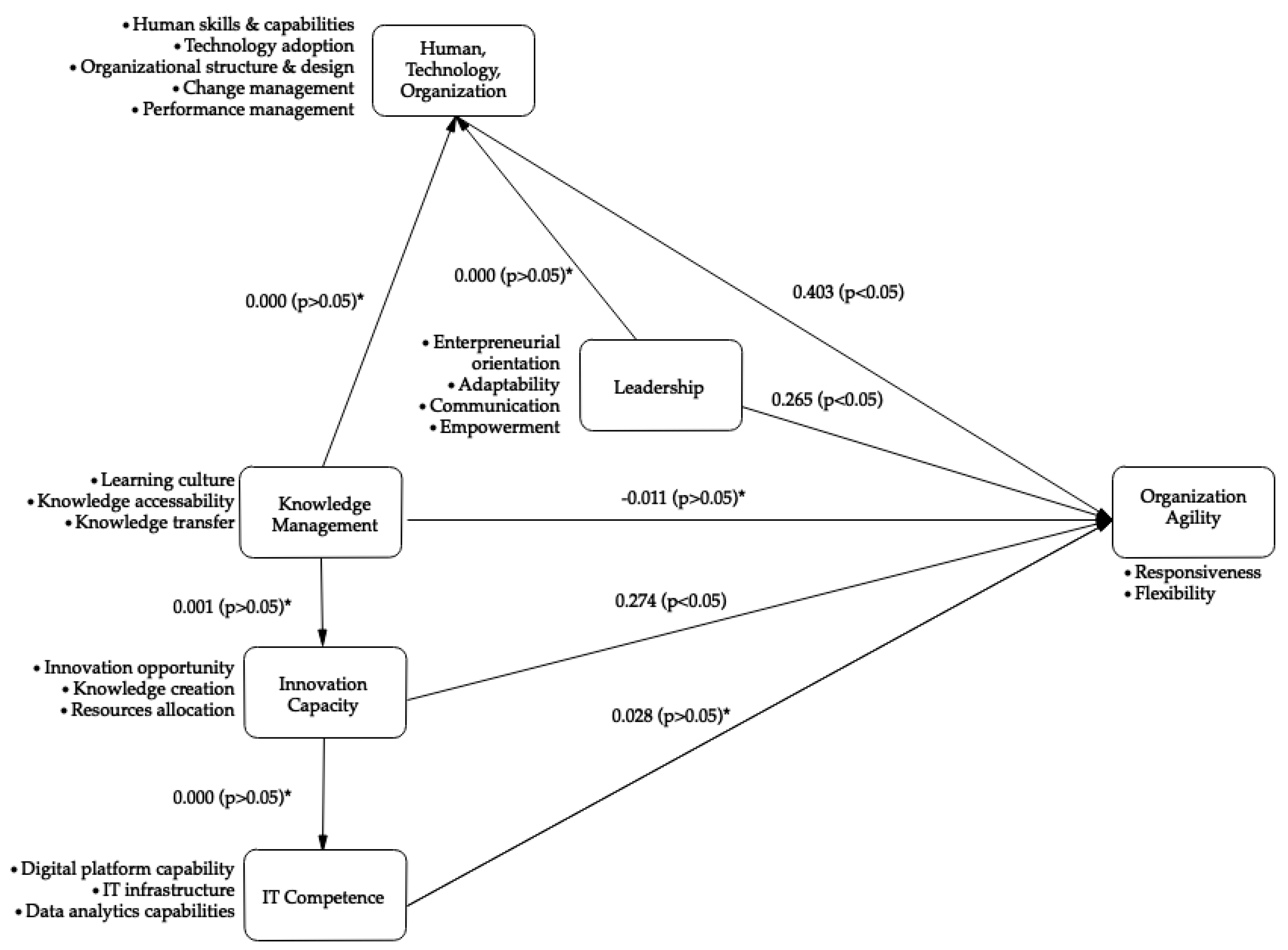 | H3: Knowledge management ➔ organizational agility | −0.011 | 0.107 | 0.102 | 0.919 | H3 rejected |