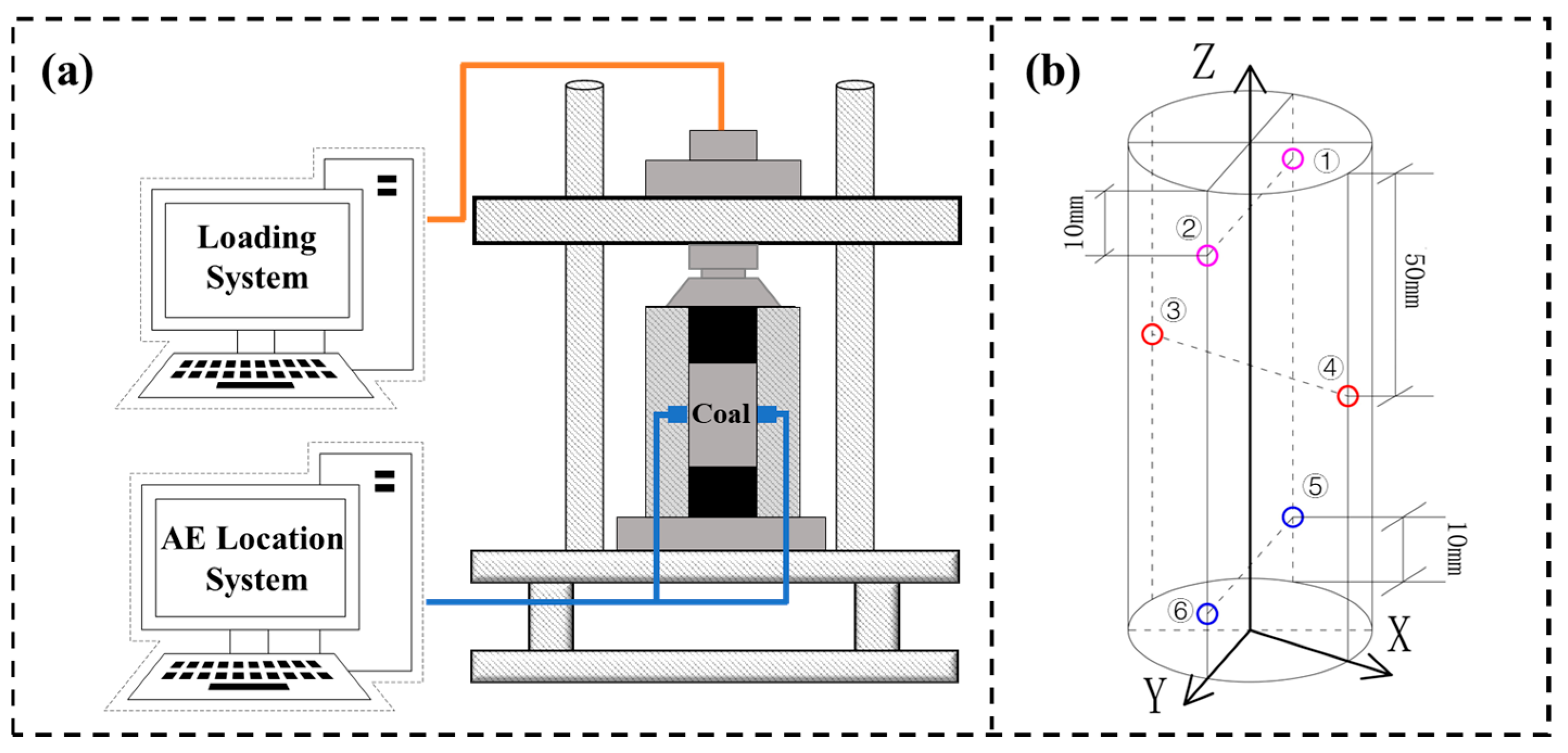 - Zhou, X.; Liu, X.; Wang, X.; Liu, Y.; Xie, H.; Du, P. Acoustic emission characteristics of coal failure under triaxial loading and unloading disturbance. Rock Mech. Rock Eng. 2023, 56, 1043–1061. [Google Scholar] [CrossRef]