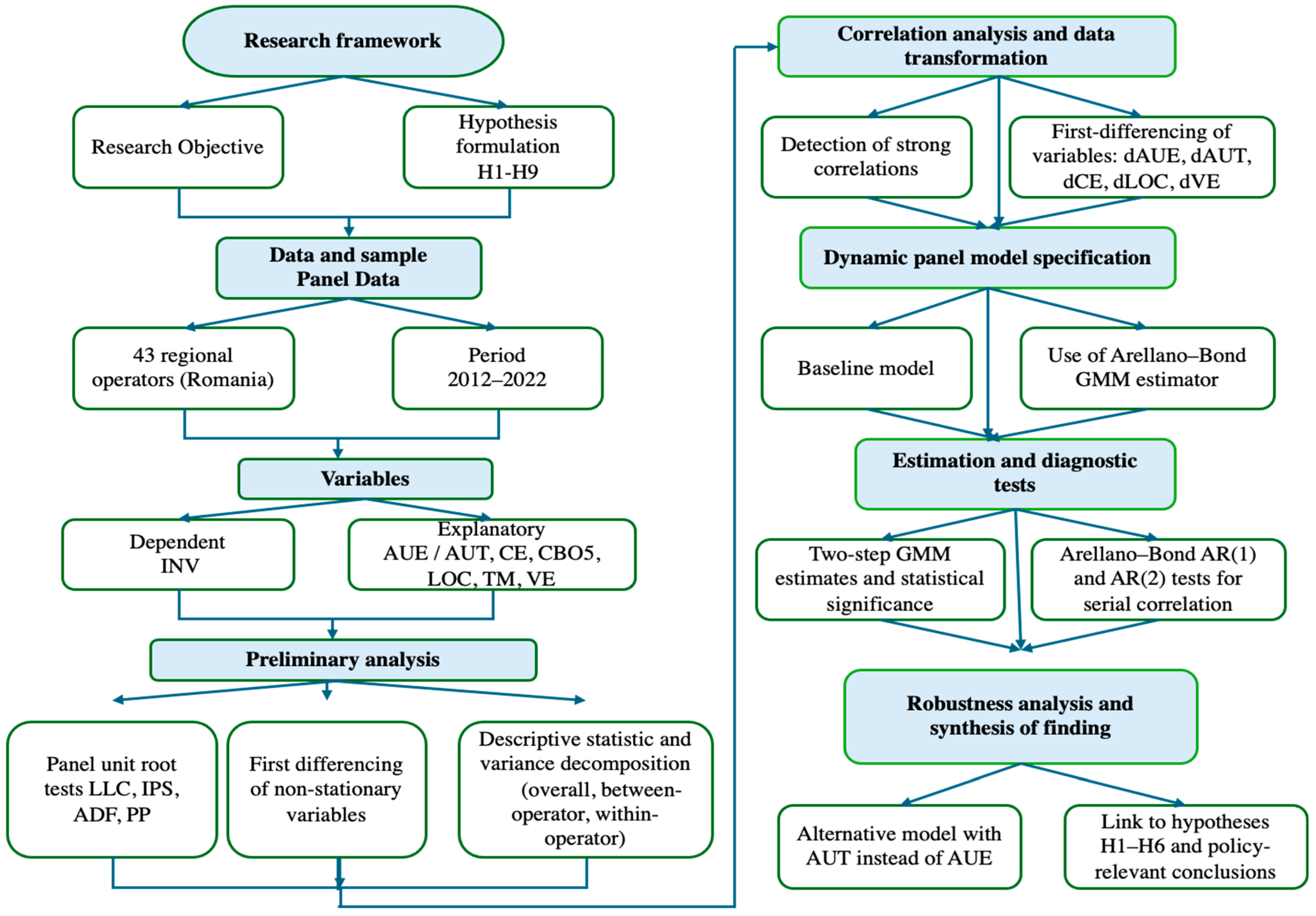 Figure 1 summarizes the research framework of this article, highlighting the links between the research objective, the set of variables analyzed, the associated hypotheses, and the econometric strategies used. Based on this framework, the following section describes in detail the database, the construction of variables, and the methodology for estimating dynamic panel data models.