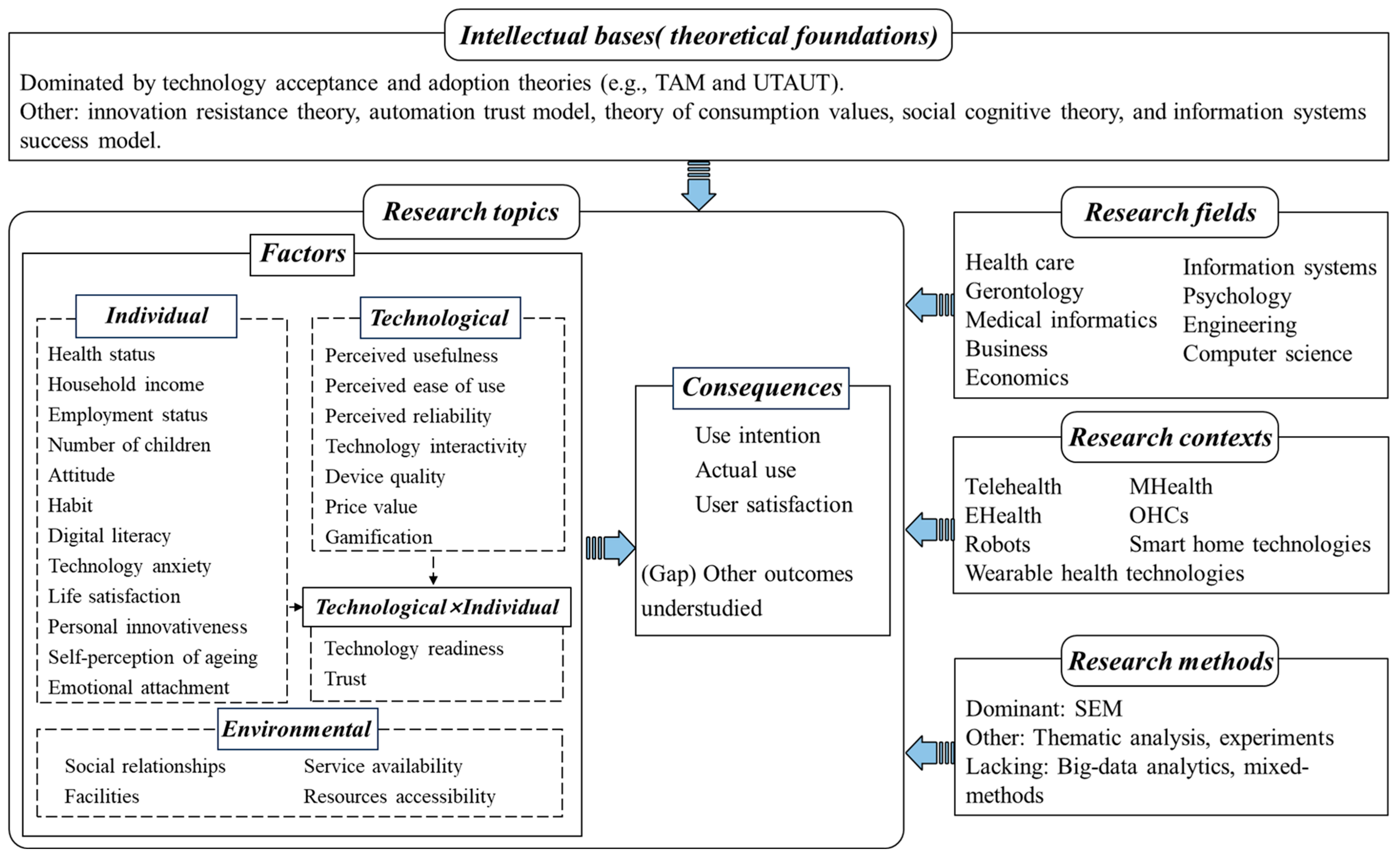 | Huang et al. (2021) [66] | Gerontechnology | 60+ | Mixed-method | TAM, Health Behavioral Model (HBM), need factors (assessed need, perceived need), resources accessibility (cost, community services, health policy), predictive factors (personal characteristics, health belief), products characteristic (usability, reliability), and adoption intention |
