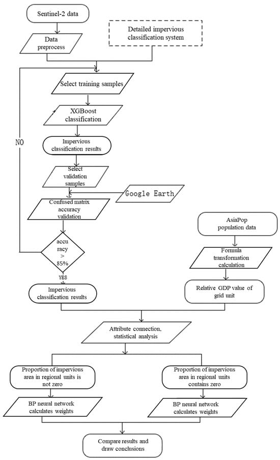 In this study, the pixel-oriented XGBoost (XGB) classification algorithm was used to construct a refined classification framework of impervious surfaces in Harbin based on Sentinel-2 multispectral data. The classification system includes 10 types of ground object targets: impermeable materials (blue steel, silver metal, red metal, brick and tile, cement, asphalt), natural surfaces (bare soil, vegetation, water), and shade categories [13]. The process of the method strictly follows the technical route shown in Figure 1, focusing on solving the problem of spectral confusion of impermeable materials in high-resolution images [14].