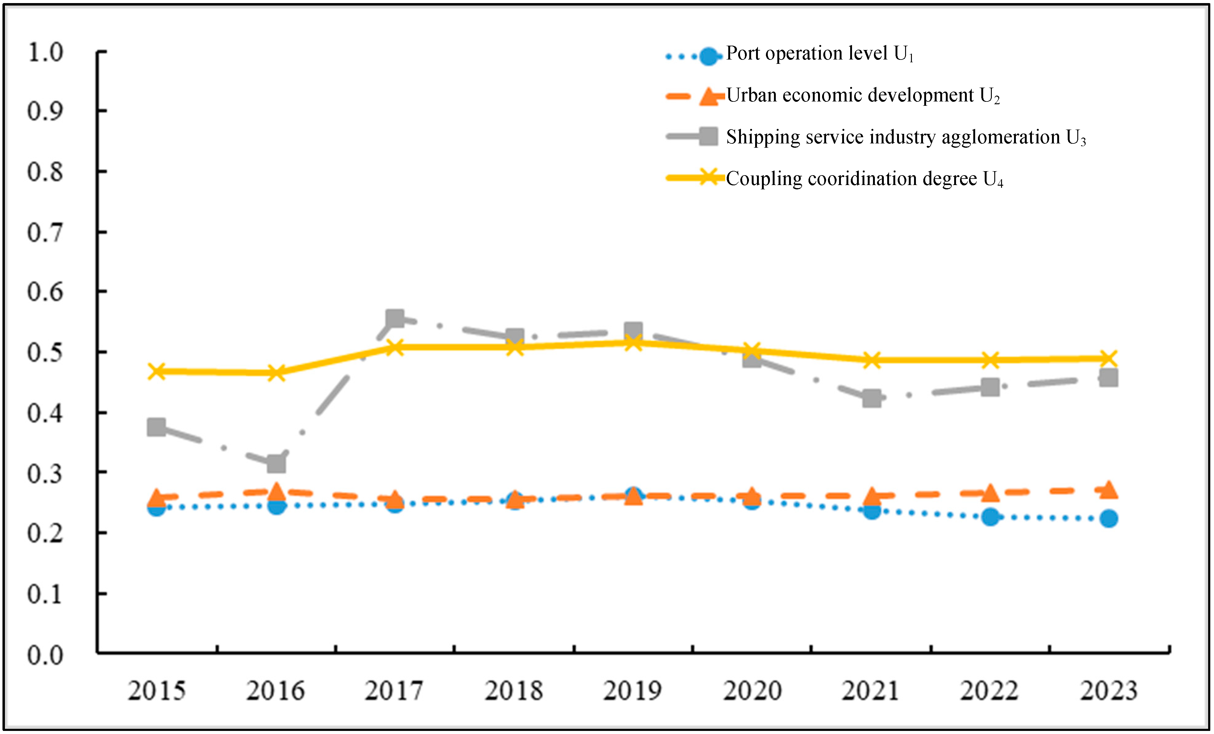| Year | Port Operations Lagging | Synchronized Development | Shipping Service Industry Lagging |
