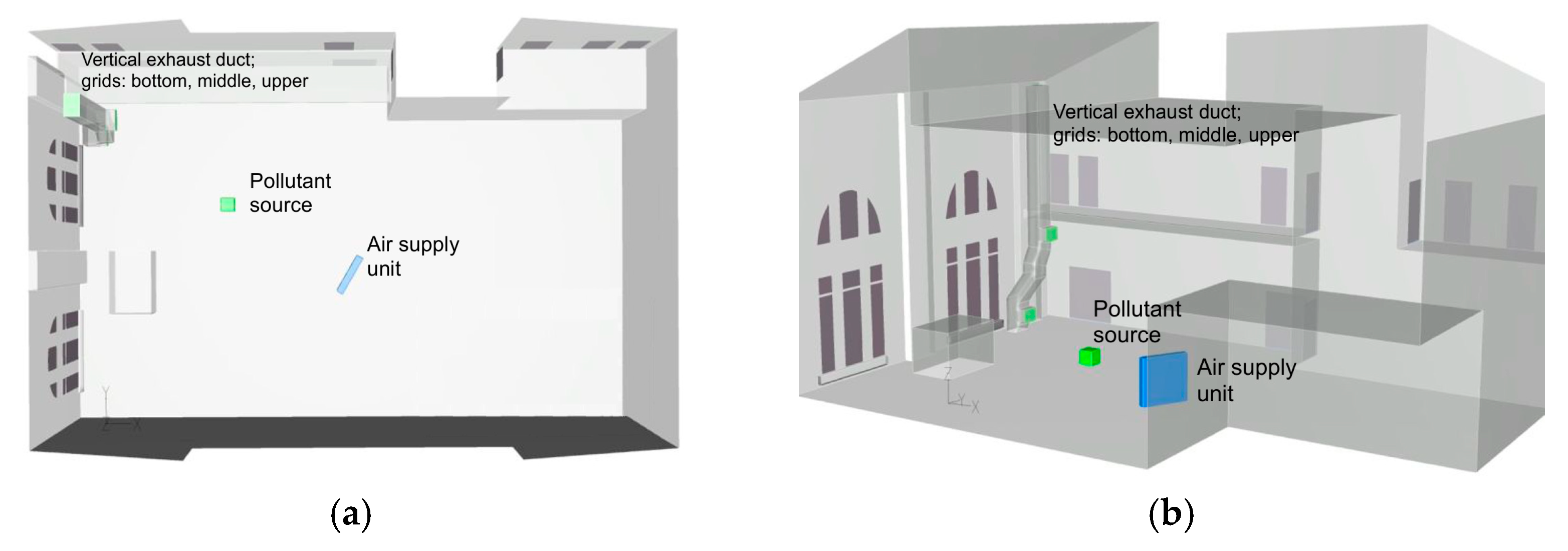 - For dense contaminants, exhaust elevation governs performance; effective removal requires near-floor capture. Mid-/high-only extraction increases the probability of plume spread and mixing in large-volume rooms.