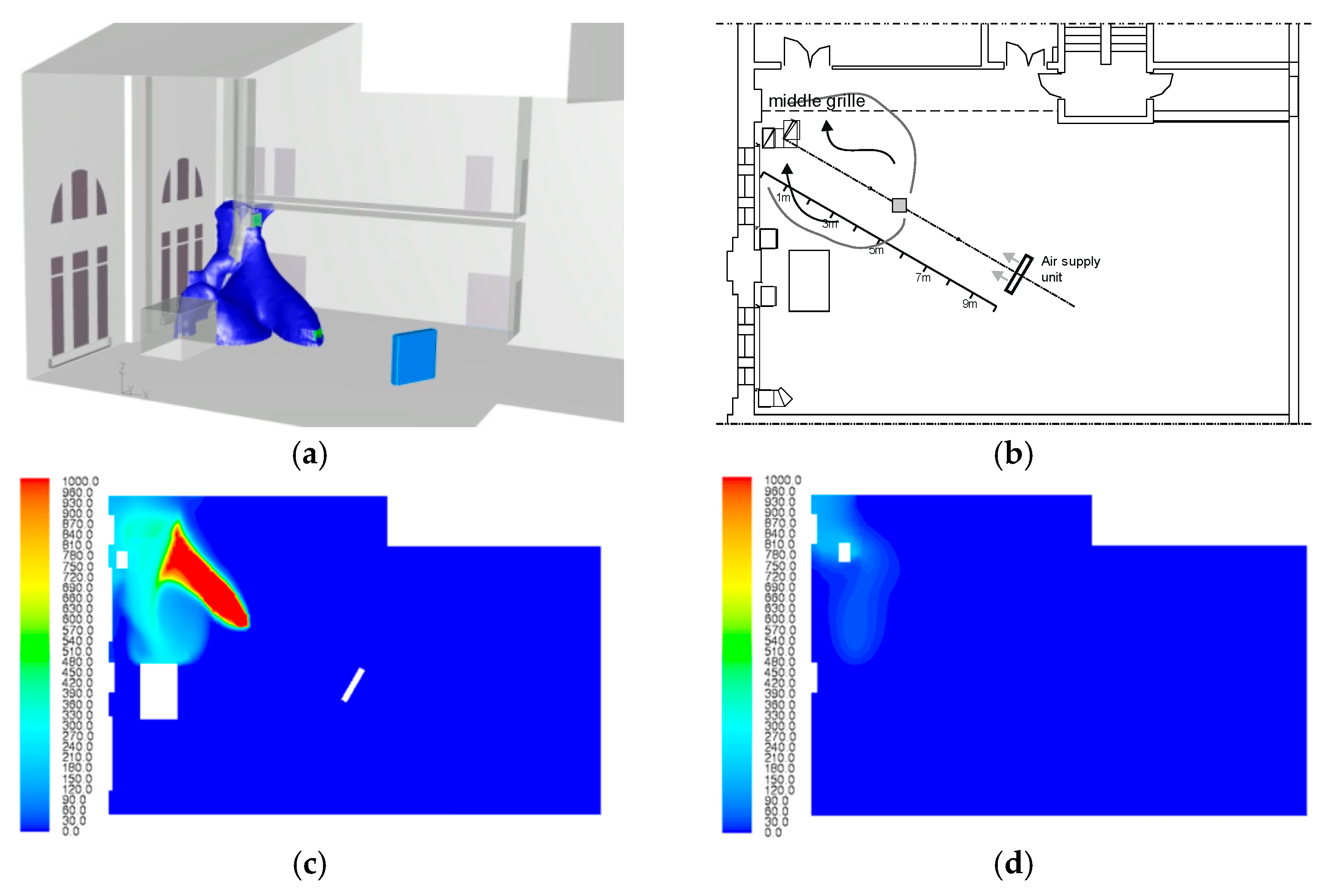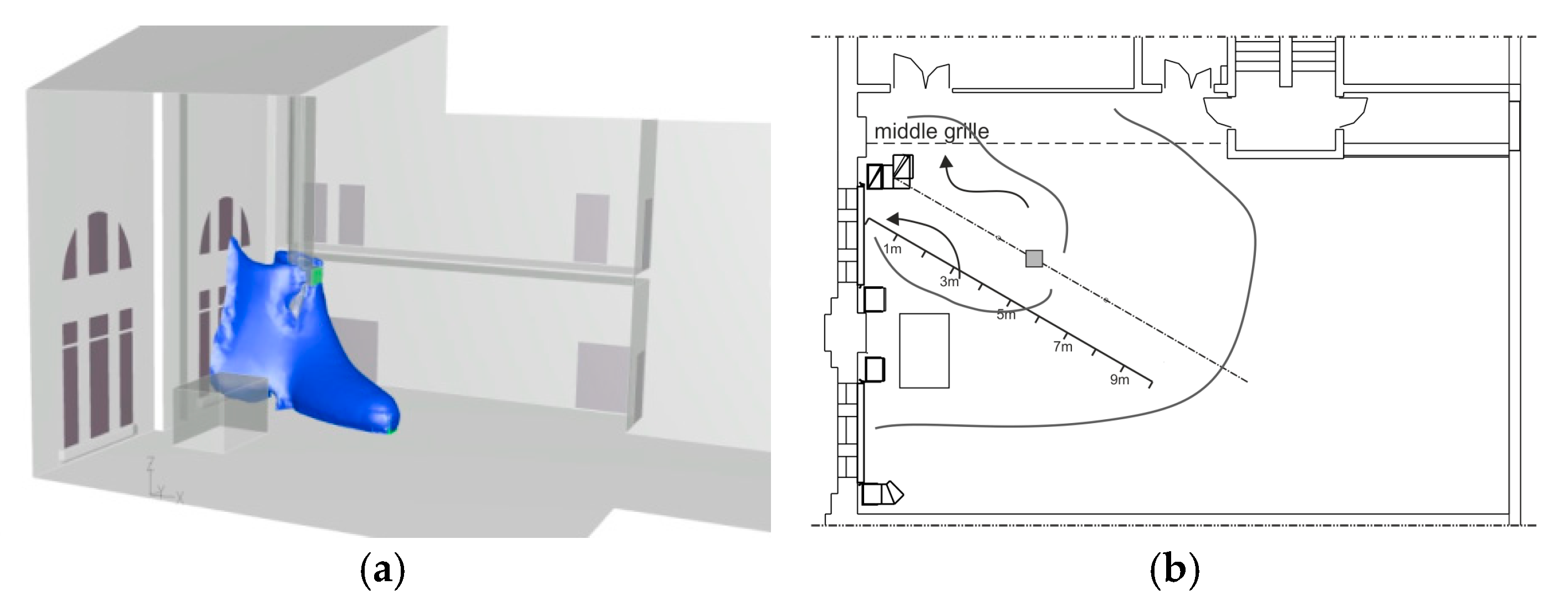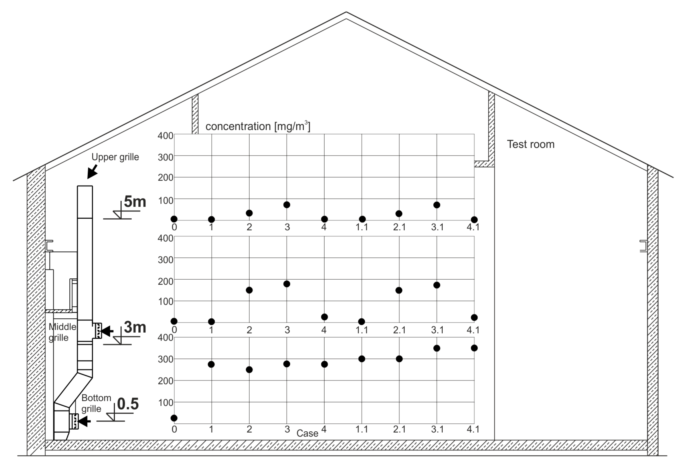 | Case 4.1 | Exhaust—3 grilles, bottom, middle, upper 3 × 4000 m3/h | yes |
