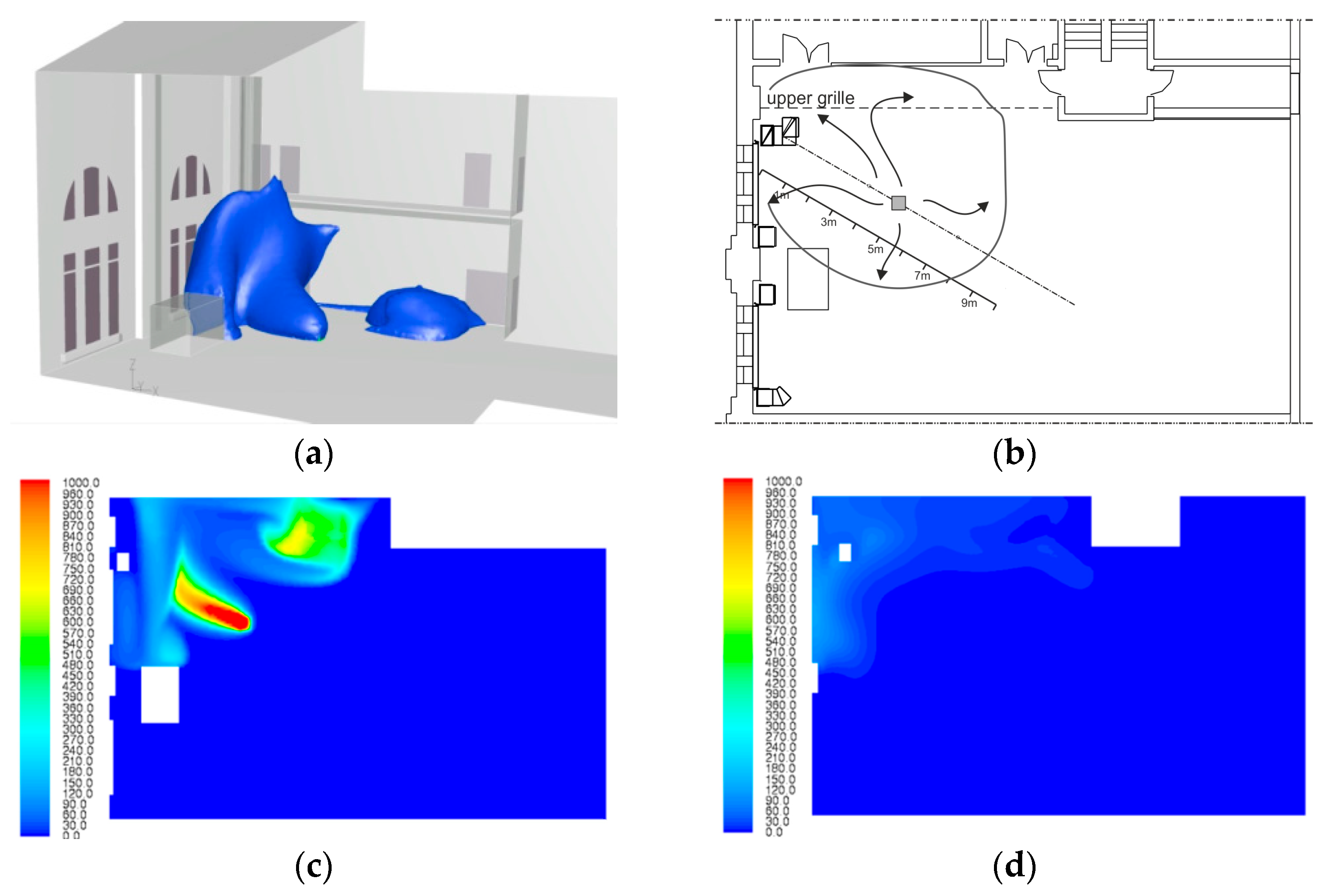 | Case 4 | Exhaust—3 grilles, bottom, middle, upper 3 × 4000 m3/h | no |