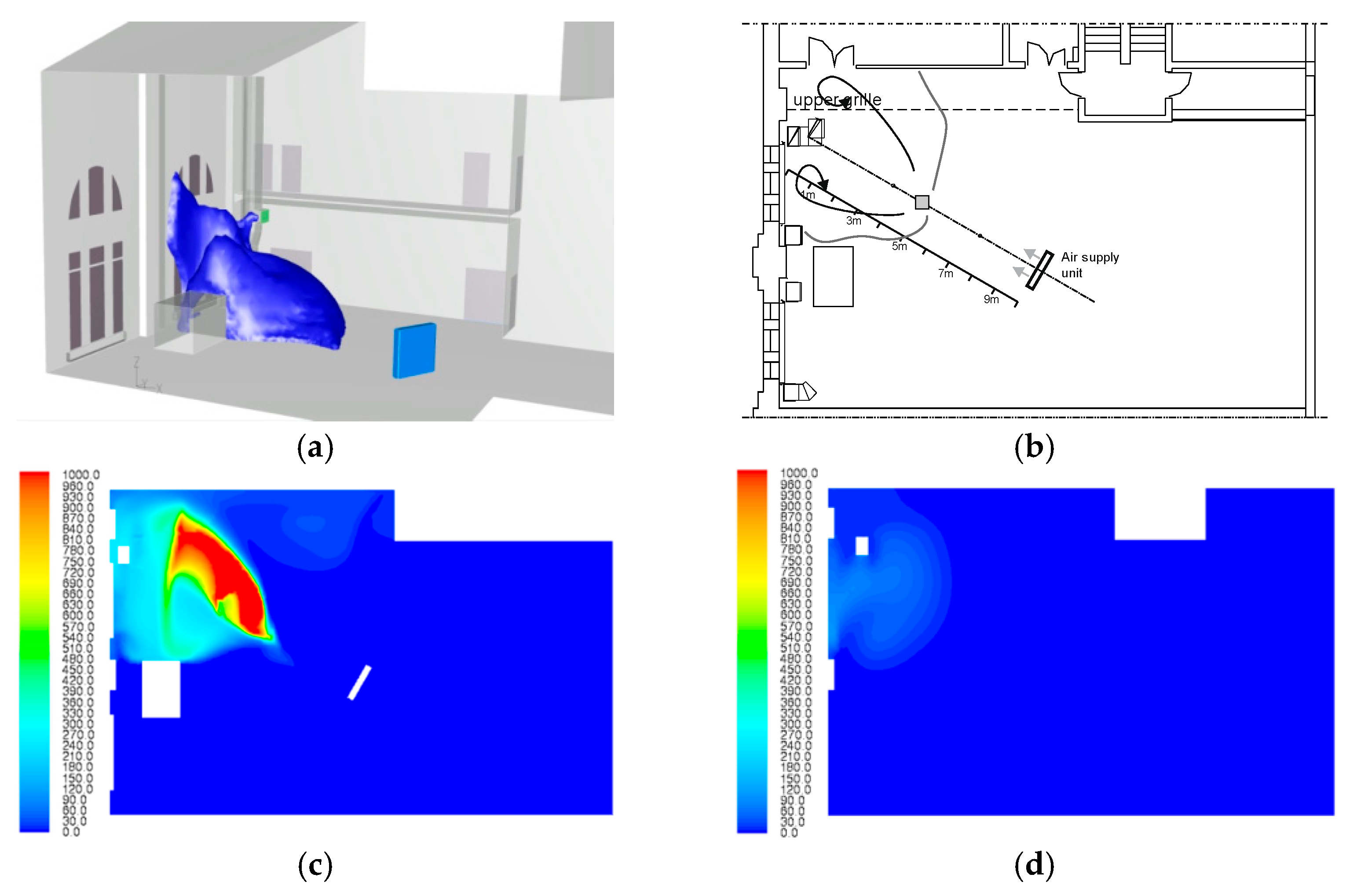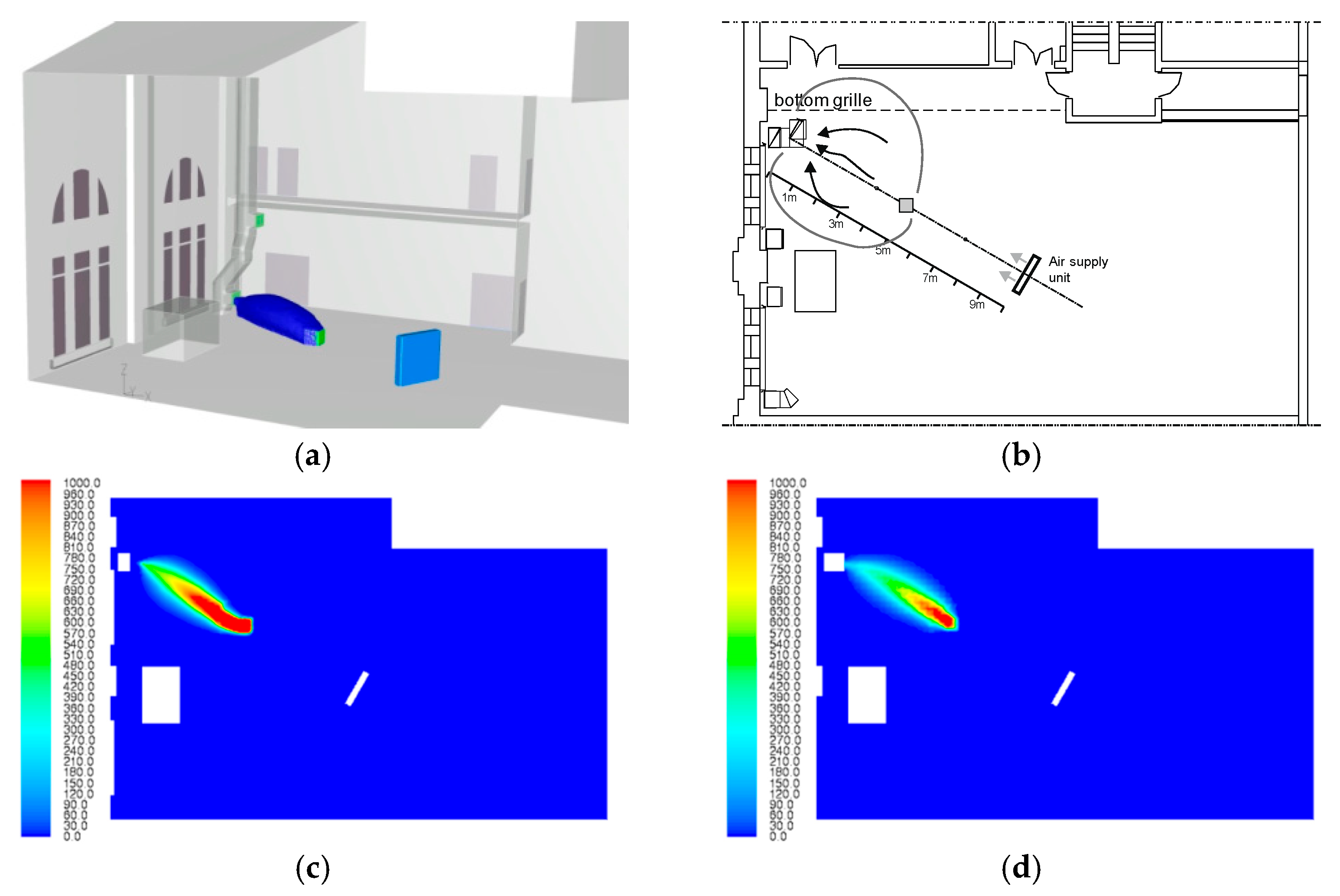 - A directed, floor-level supply jet is beneficial only when paired with low-level exhaust, where it shortens the transport path and stabilizes capture. In combination with mid/high extraction, assisted supply tends to erode the floor layer and should be disabled or carefully limited.