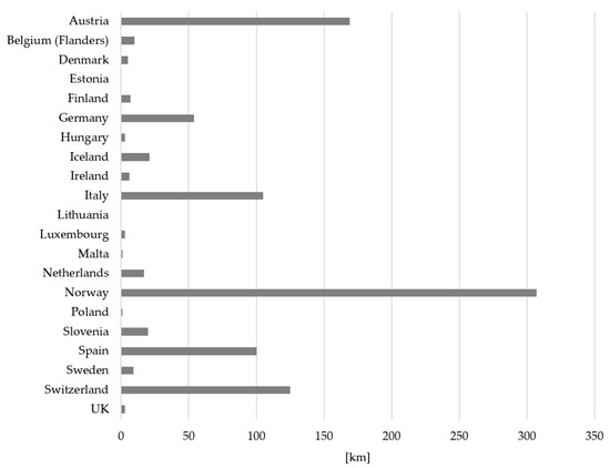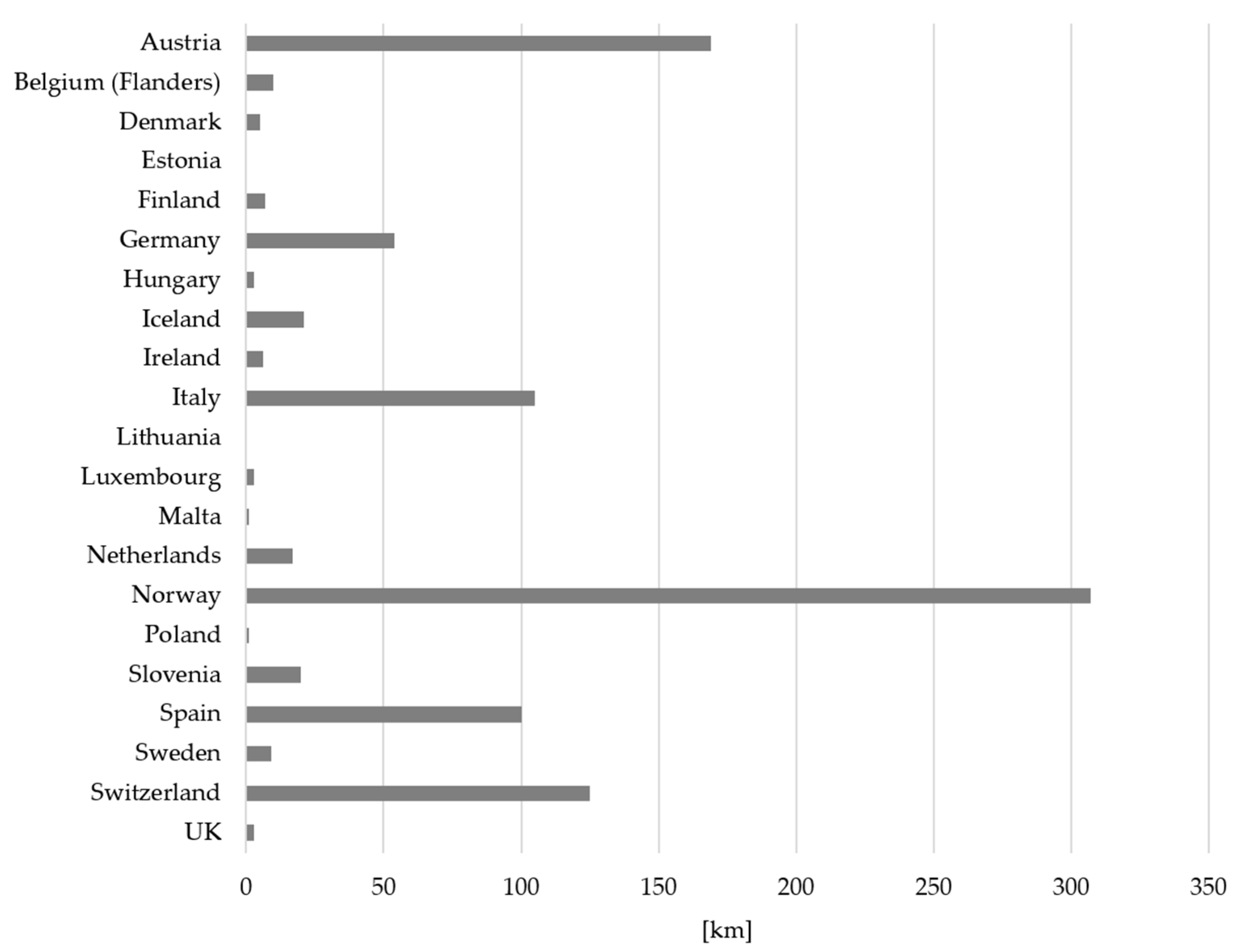In recent decades, the development of underground infrastructure has become one of the key components of European transport policy. As highlighted in the European Commission report Standardisation needs for the design of underground structures [1], tunneling projects in Europe constitute a significant share of the infrastructure market, and the demand for tunnels remains consistently high [2]. Tunneling plays an essential role in ensuring the continuity and capacity of transport networks, particularly in mountainous regions, cross-border corridors, and densely urbanized areas [3]. In the context of the European transport network, it is worth referring to data from the Trans-European Transport Network (TEN–T), which presents the lengths of road tunnels (over 0.3 km) in individual countries (Figure 1). The dynamic development of tunnel investments is further confirmed by numerous projects carried out in recent years within the TEN–T framework, including both the modernization of existing facilities and the construction of new ones.